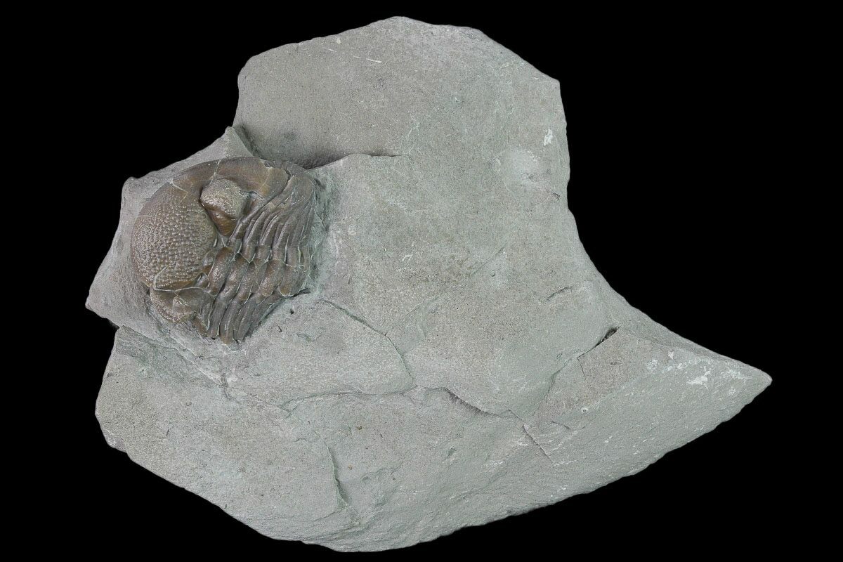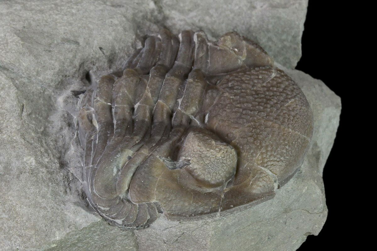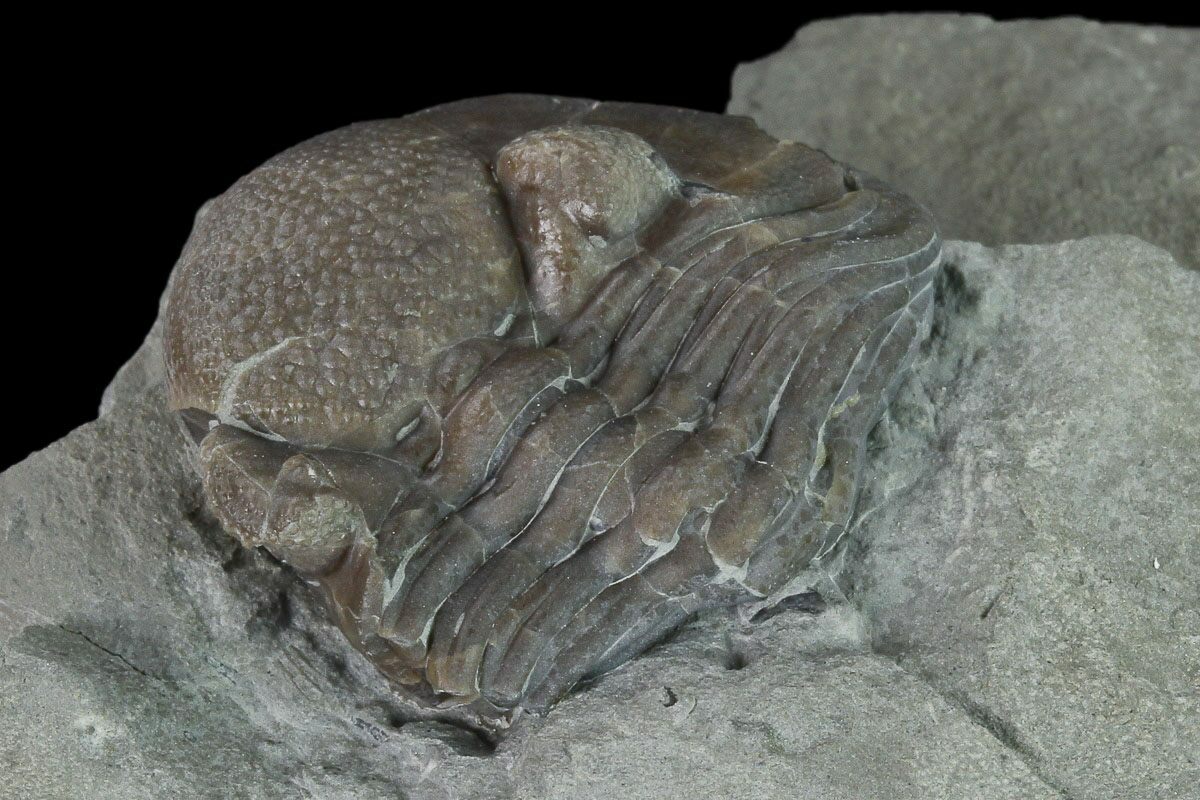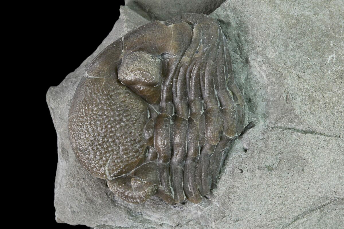 This one is 1.02" wide, enrolled and still partially embedded in the shale it was found in. Good eye facet preservation.