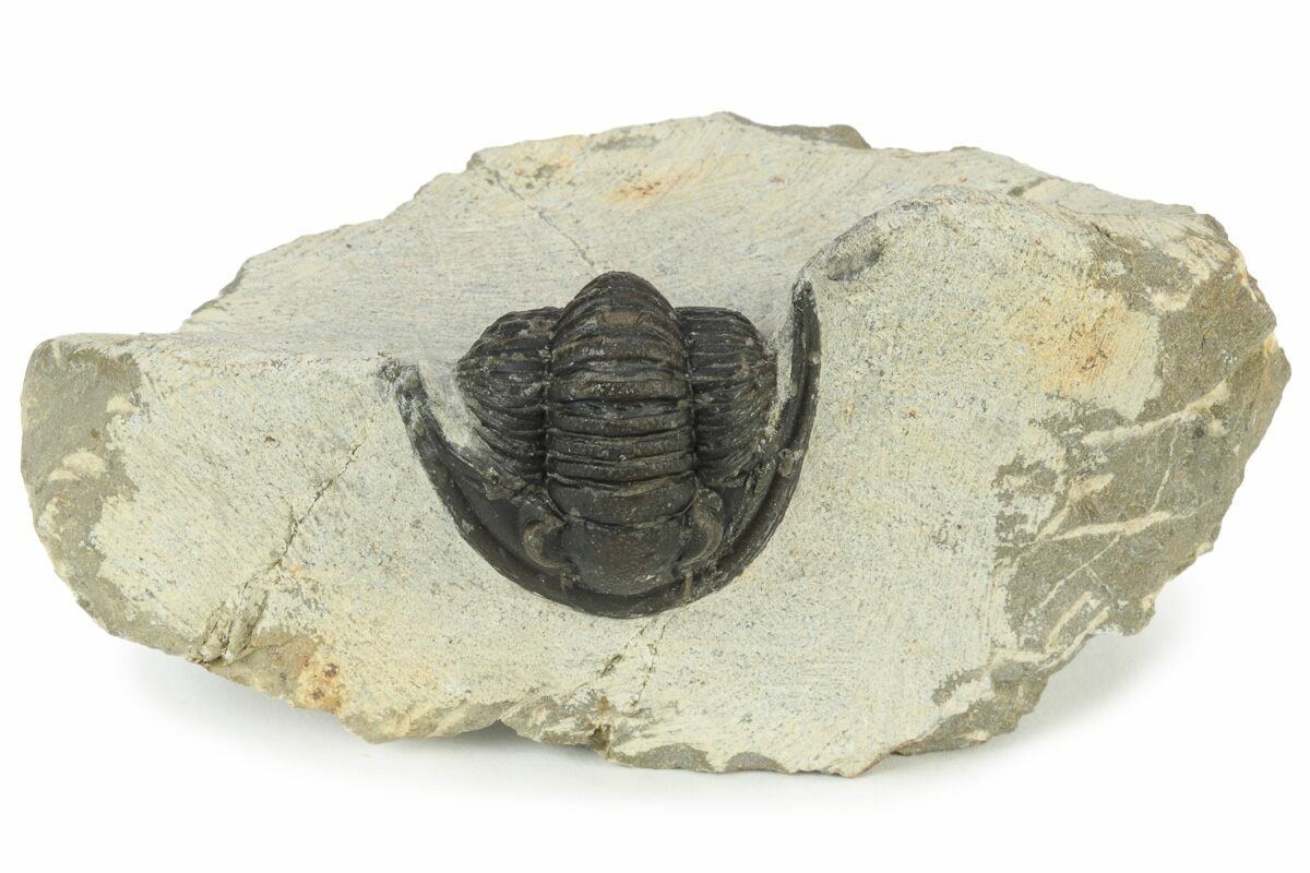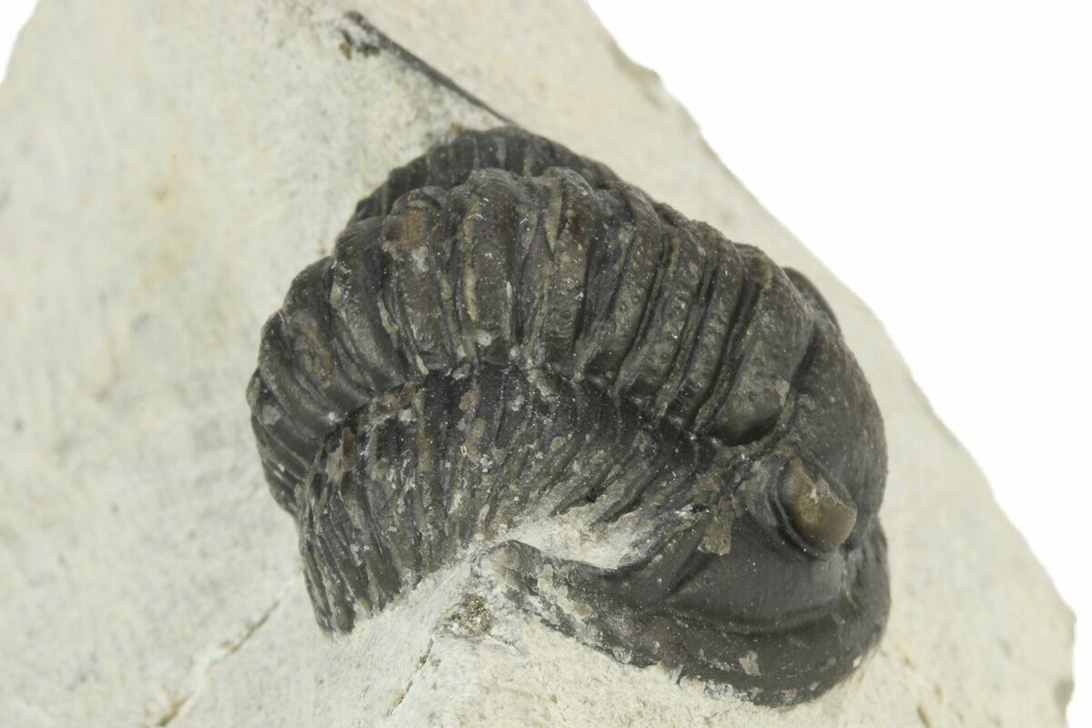 This a 1.2" long Cornuproetus trilobite from Morocco. This proetid trilobite displays it's distinctive swept-back genal spines. Tiny eye facets can be seen in the right eye under magnification.