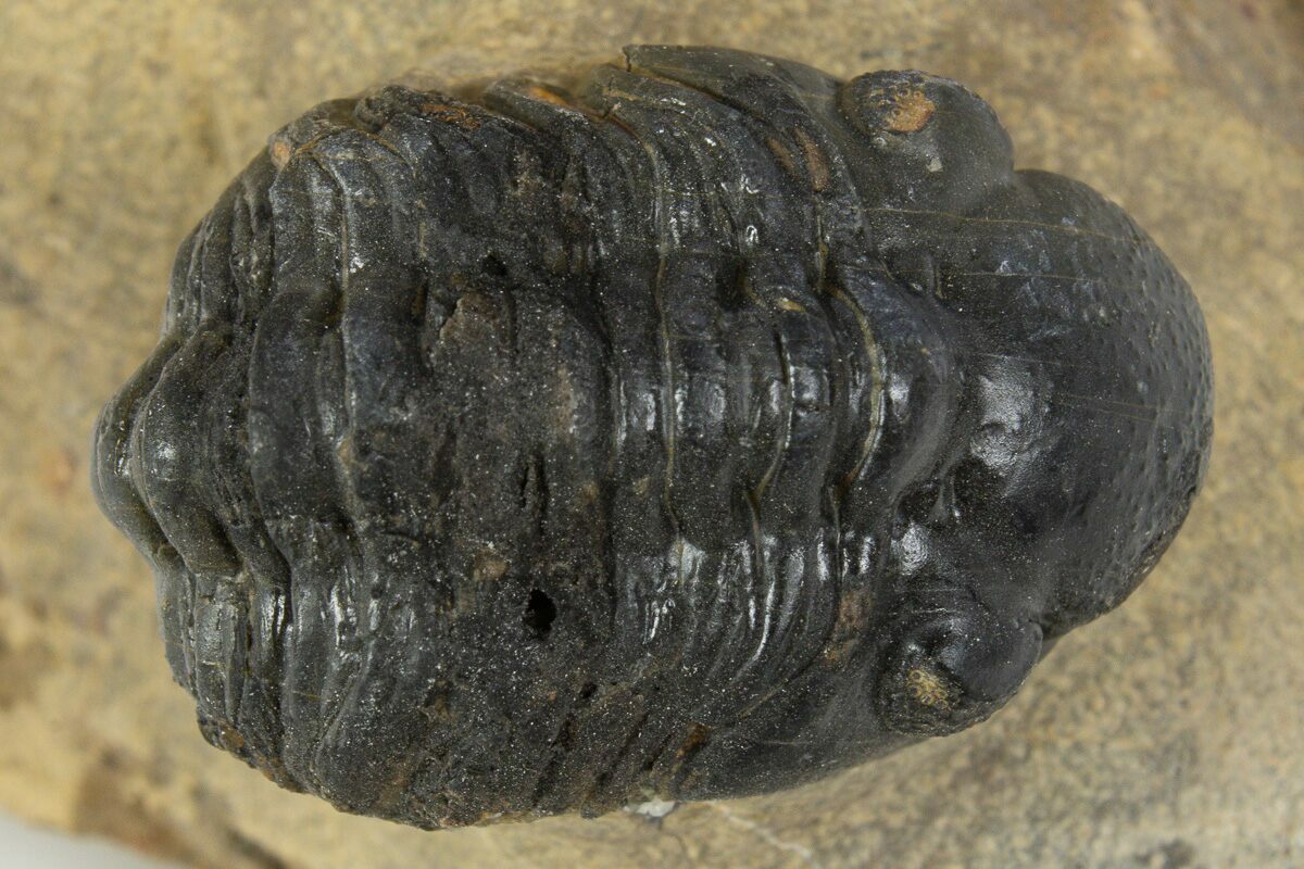 This is a 1.5" long, Reedops trilobite collected near Atchana, Morocco. It has a lot of surface detail including, visible, preserved eye facets in both eyes. It has about 10% shell restoration in total, hence the bargain price.