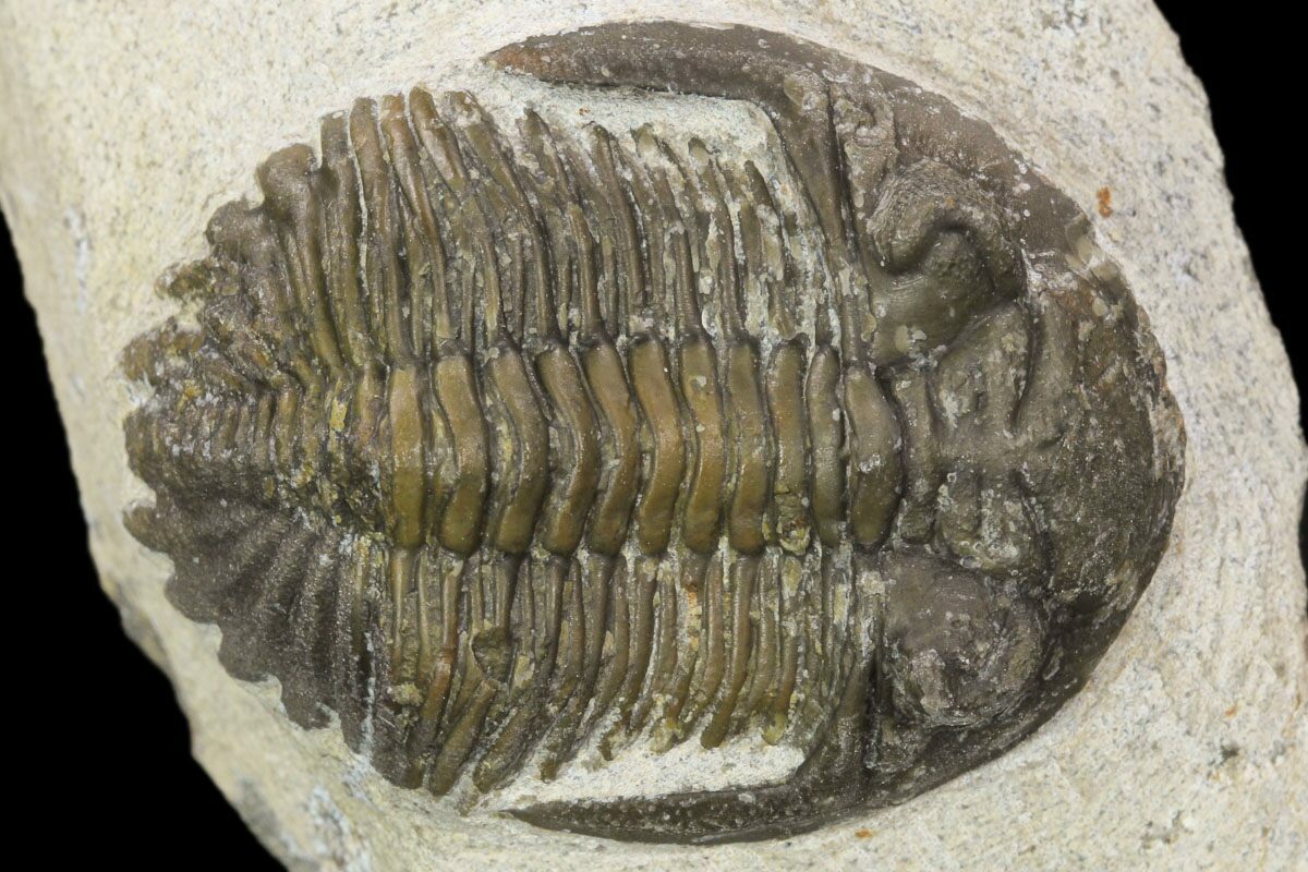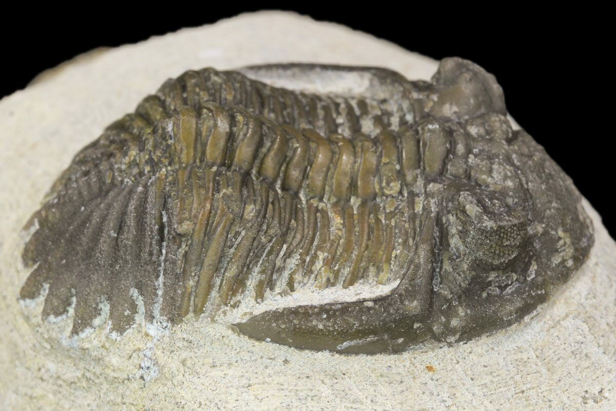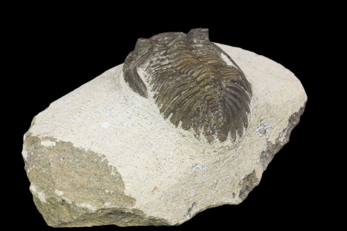 This is a bargain Hollardops mesocristata trilobite quarried near Ofaten, Morocco. It shows quite a bit of surface detail including preserved eye facets. It has been prepared with air scribes and air abrasives so that it looks like it is ready to crawl off of the rock. The preparation is a bit rough, hence the bargain price.