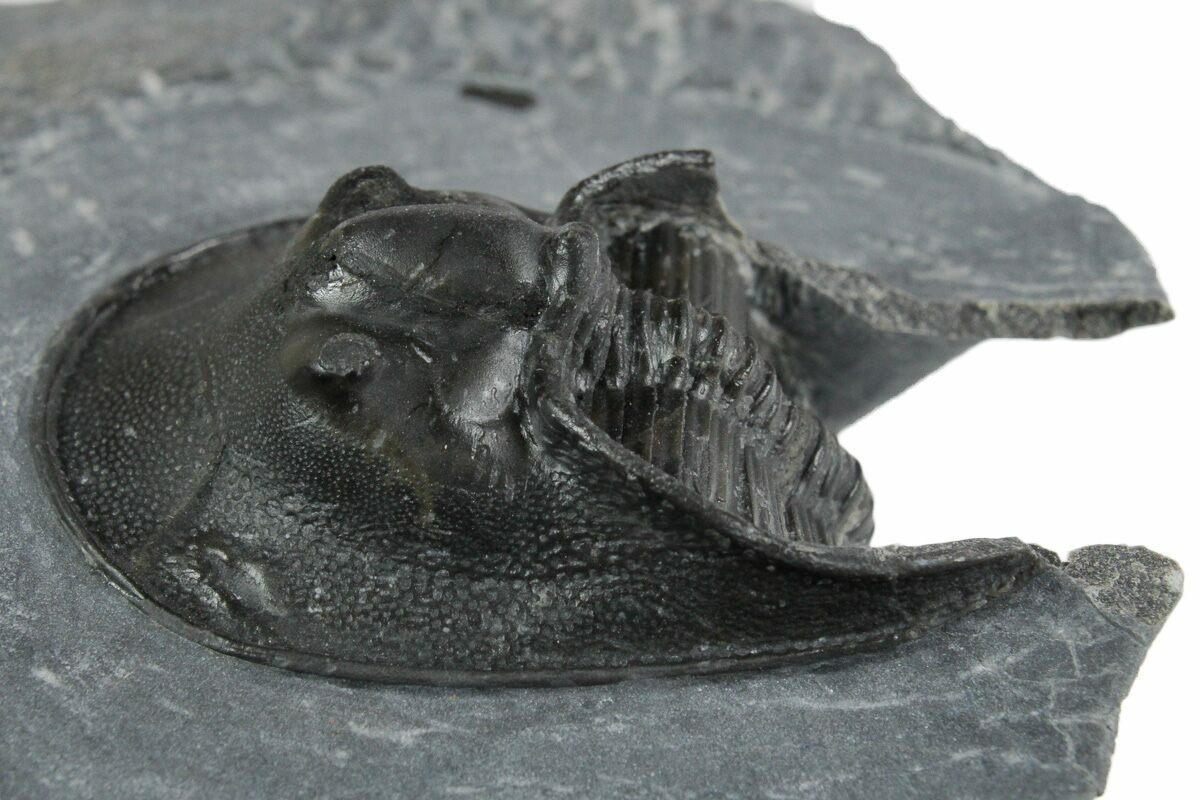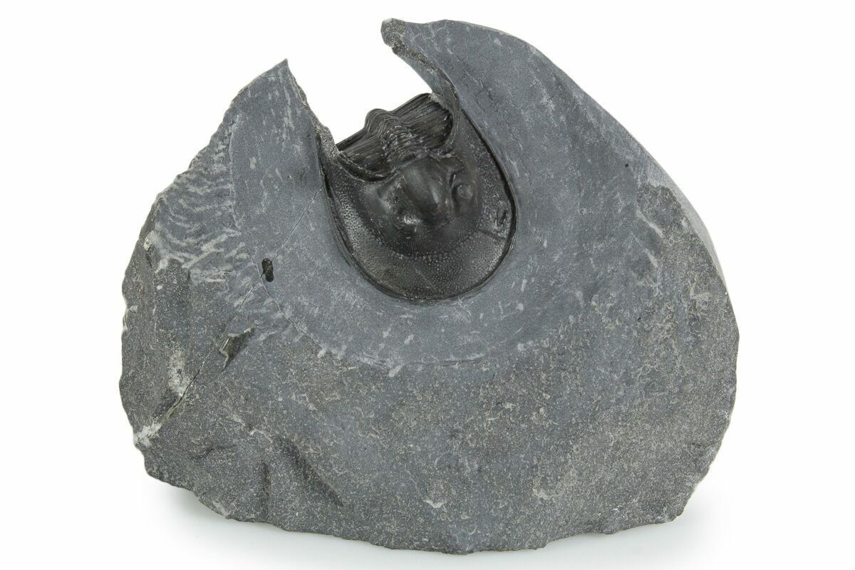 This is a bargain, 1.6" long, prone Harpid (Scotoharpes sp.) trilobite from the El Otfal Formation near Boudib, Morocco. This particular specimen is bargain priced because it appears to be a composite, that is the back of the thorax appears to have been added from another partial trilobite. Otherwise it does not have any restoration.