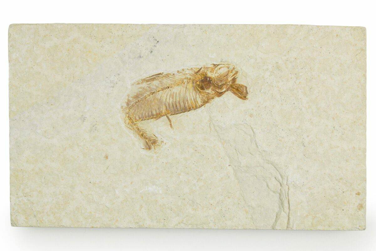 This is a detailed, 1.7" long fossil fish (Knightia eocaena) from our Fossil Lake Safari quarry near Kemmerer, Wyoming. The fish is immobile as a result of sustaining a broken back, hence the reduced price.