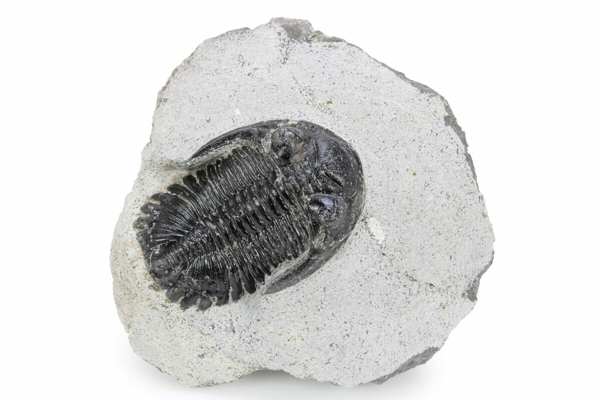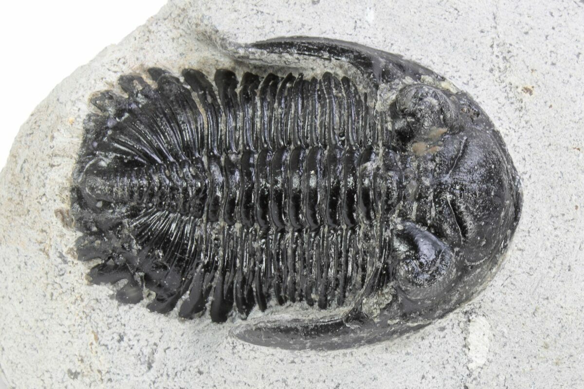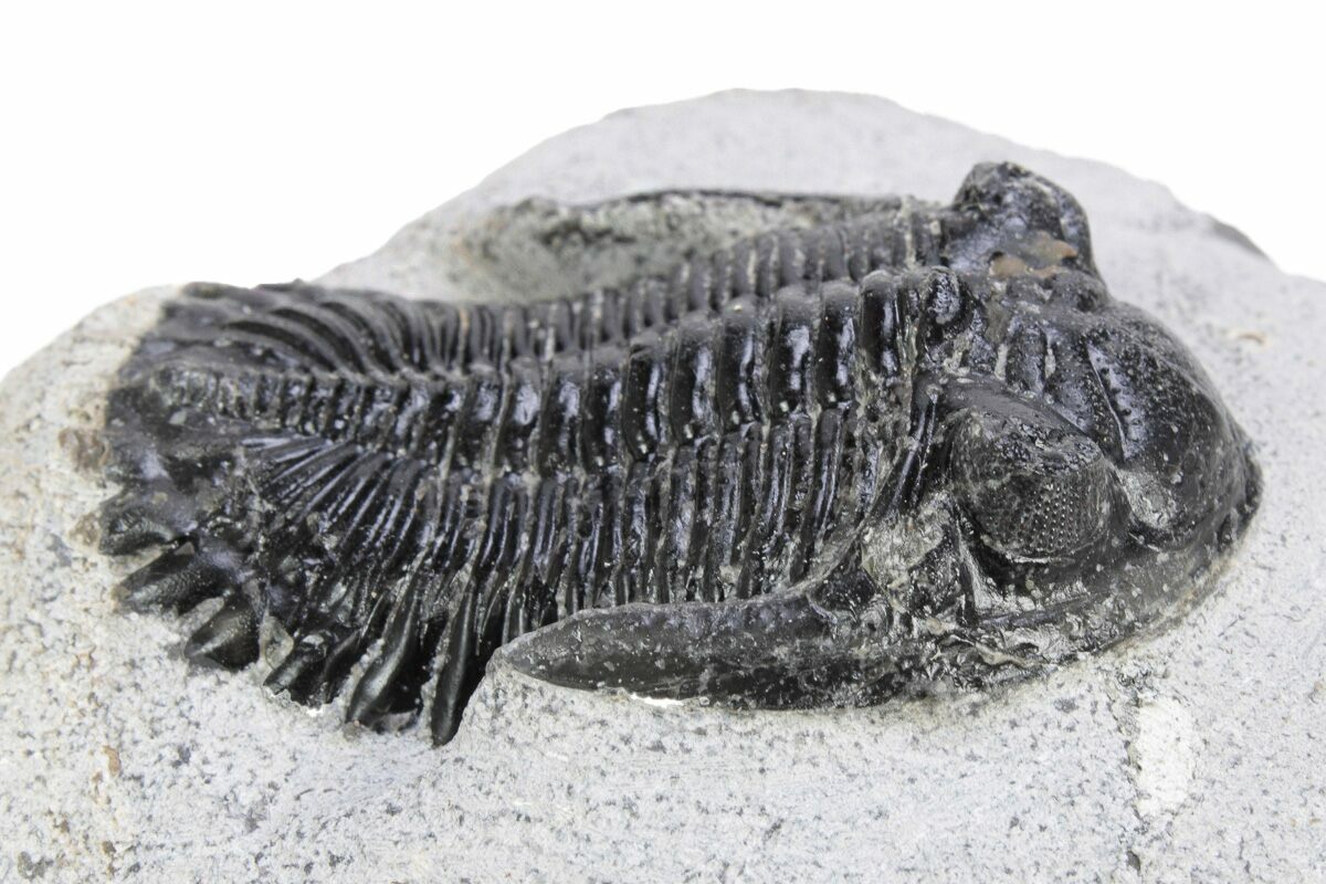 This is a detailed, 1.75" long Hollardops trilobite fossil quarried near Ofaten, Morocco. It has visible eye facet preservation in both eyes. It has about 3% shell restoration in total.
