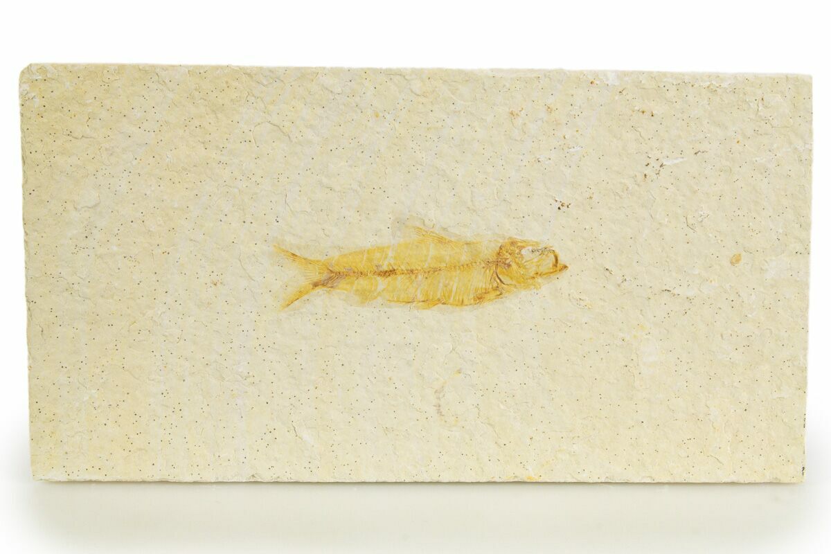 This is a 1.8" long fossil fish (Knightia eocaena) from our Fossil Lake Safari quarry near Kemmerer, Wyoming. Its bone structure, fins, and scale structure are visible.