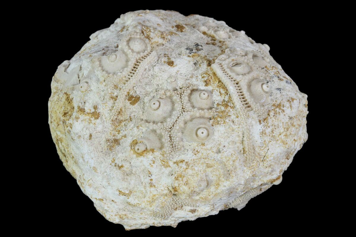 This is a 1.8" fossil sea urchin (Drocidaris taouzensis) from Taouz, Morocco. It is completely removed from the surrounding limestone. Missing shell and deformation occurred during fossilization.