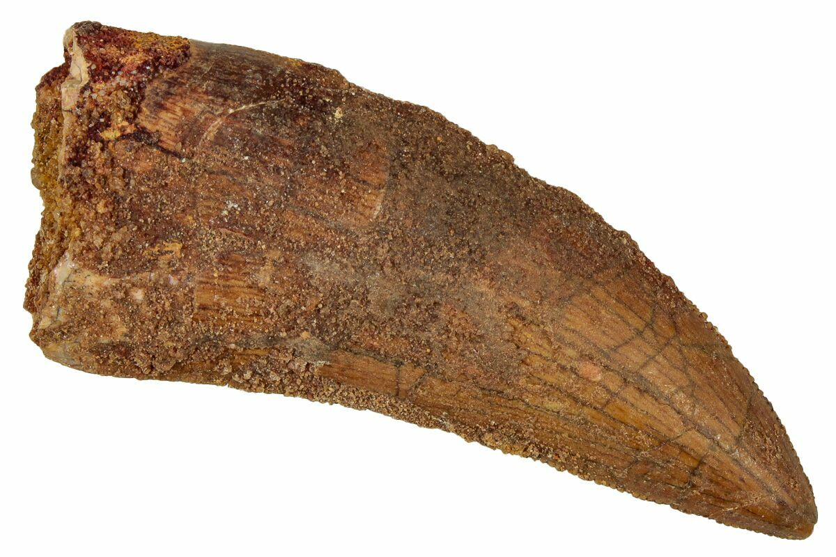 This is a good-sized, serrated, 2.01" long tooth of a Carcharodontosaurus from the Late Cretaceous Kem Kem Beds of Morocco. Carcharodontosaurus was a massive predatory dinosaur larger than Tyrannosaurus rex.