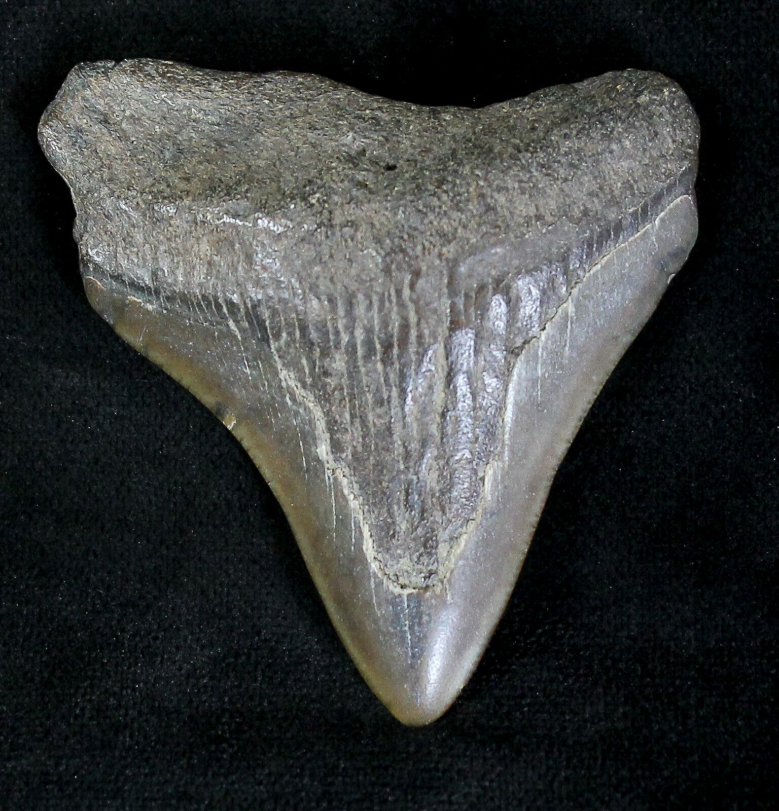 This is a small Megalodon tooth collected from South Carolina. A tooth of this size would have come from a juvenile Megalodon shark.