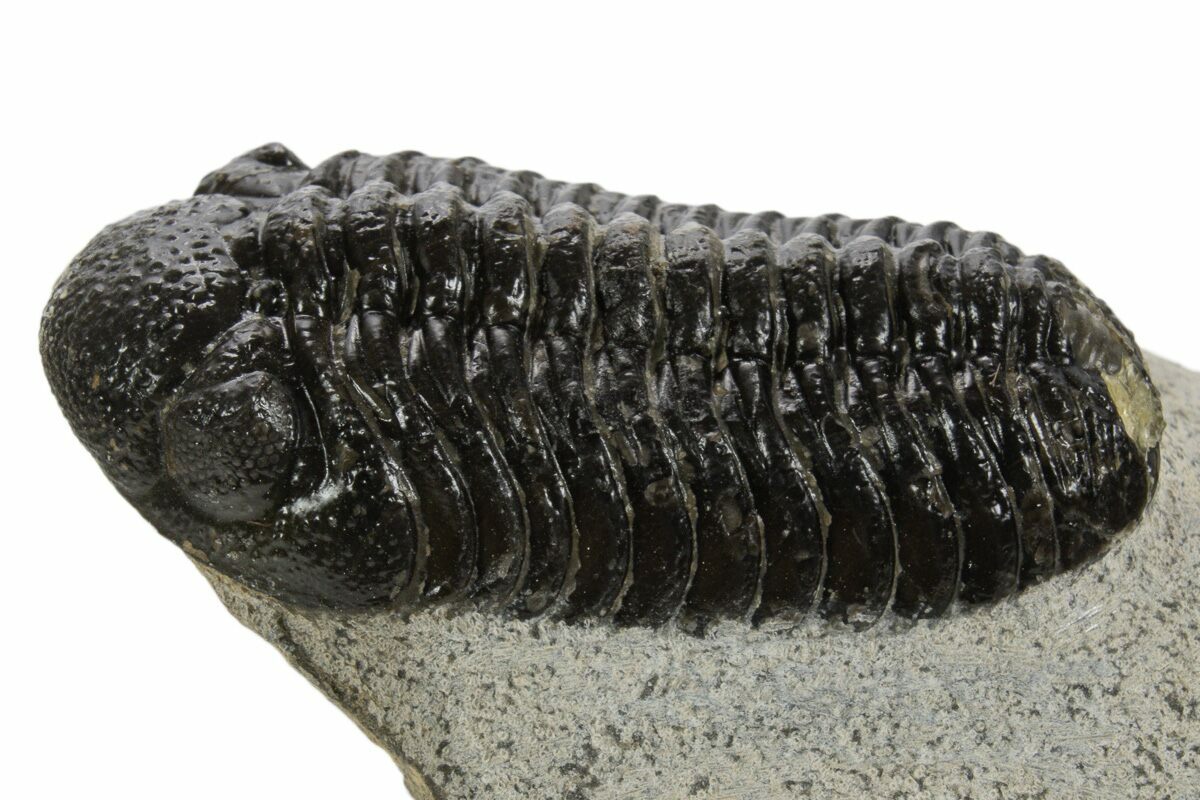 This is a 2.1" long Morocops trilobite from Ofaten, Morocco. Good eye facet preservation can be seen in both eyes. It has about 4% shell restoration in total.