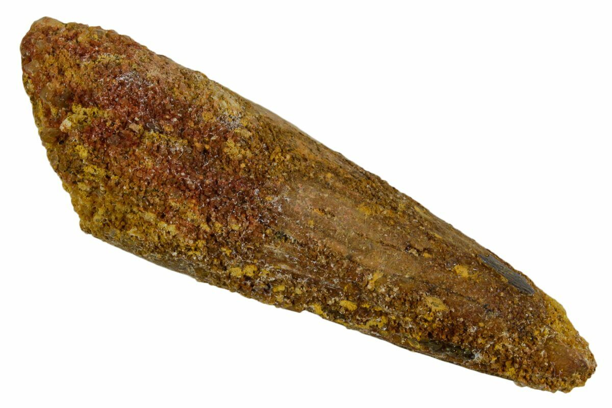 Spinosaurus teeth are relatively common fossils, but large (3+ inches), well-preserved examples are rare. These large Spinosaurus teeth will often be heavily doctored. We’ve seen many examples where multiple partial teeth can been glued to together to create a larger fake tooth, or where enamel has been painted on. One giveaway to look for is a ring of sand around the middle of the tooth, usually glued on to hide a break. Sometimes this is a sign that multiple partial teeth have been composited, but other times it is used to disguise a badly done repair job.