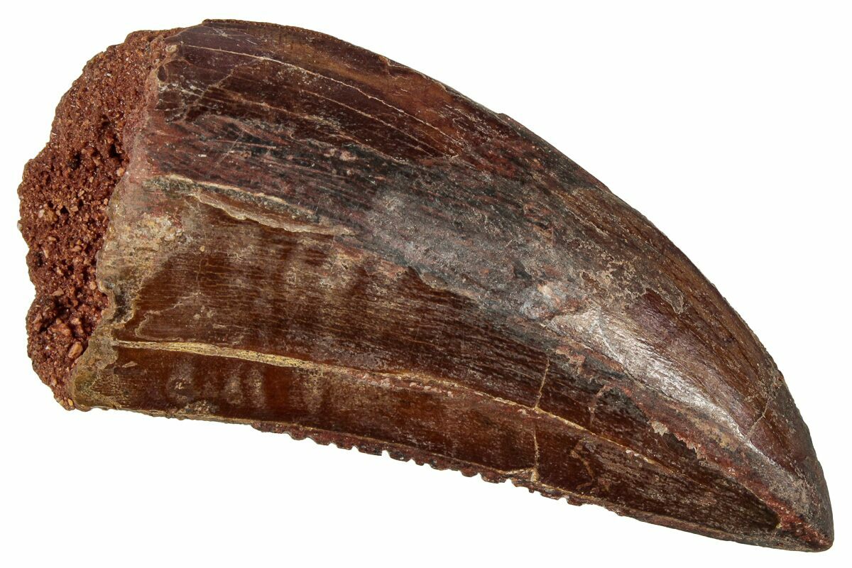This is a good-sized, serrated, 2.14" long tooth of a Carcharodontosaurus from the Late Cretaceous Kem Kem Beds of Morocco. Carcharodontosaurus was a massive predatory dinosaur larger than Tyrannosaurus rex.