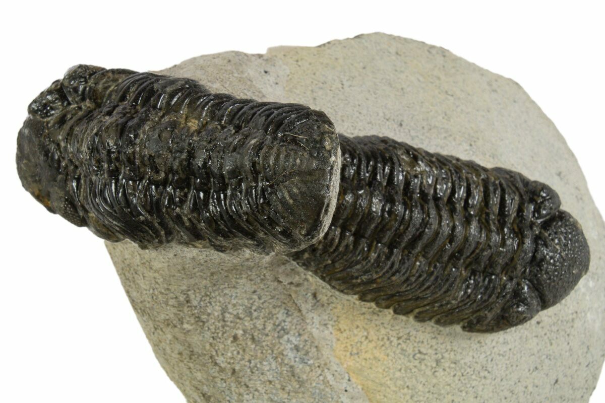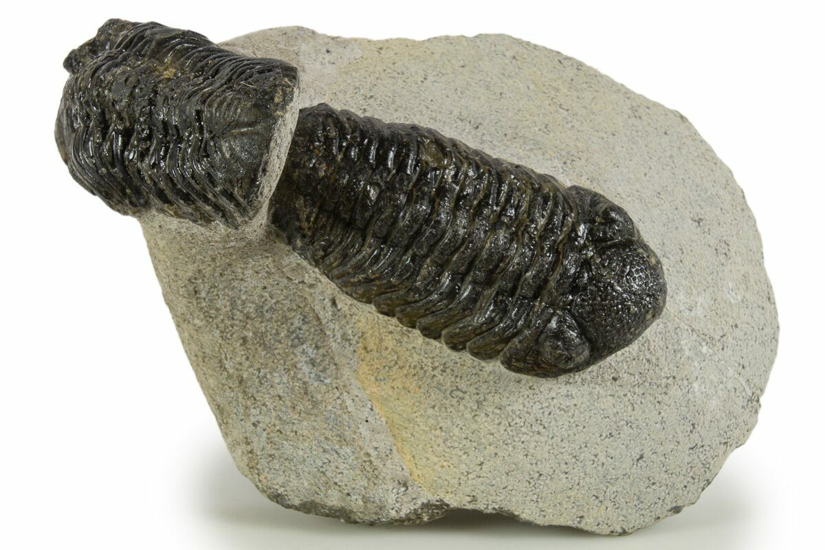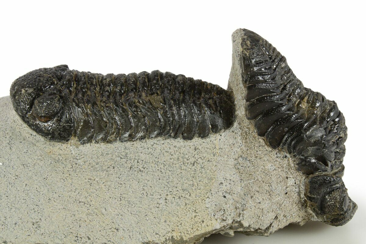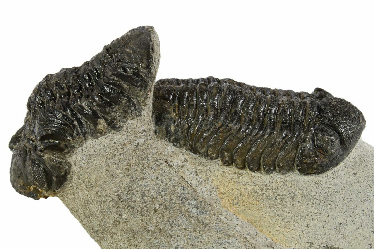 This is a 2.3" long Morocops trilobite associated with a similarly sized Austerops. You get two different genus of phacopid trilobites on the same piece. The preparation is pretty rough and there is about 10% shell restoration on the Austerops, hence the bargain price.