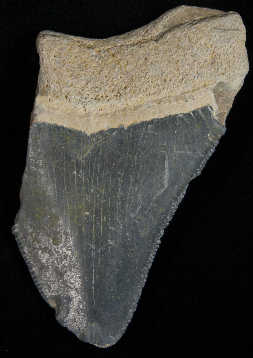 This is a bargain, serrated grey Megalodon tooth from the Bone Valley region of Florida. Teeth from the land sites in the Bone Valley region of Florida are highly coveted by collectors for their beautiful coloration and outstanding preservation. This area is thought to have been a nursery area from the Megalodon due to the high concentration of small Megalodon teeth.