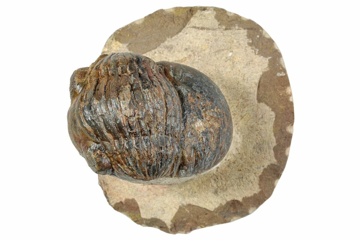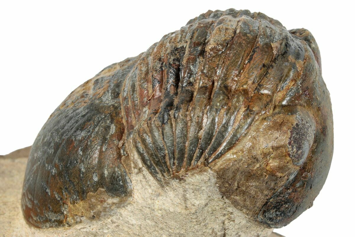 This is a detailed, 2.4" long, brown Paralejurus trilobite collected near Lghaft, Morocco. You can even see hundreds of tiny eye facets in its eyes under magnification. It has about 1-2% shell restoration along a repaired crack and is missing its right cheek, hence the bargain price.