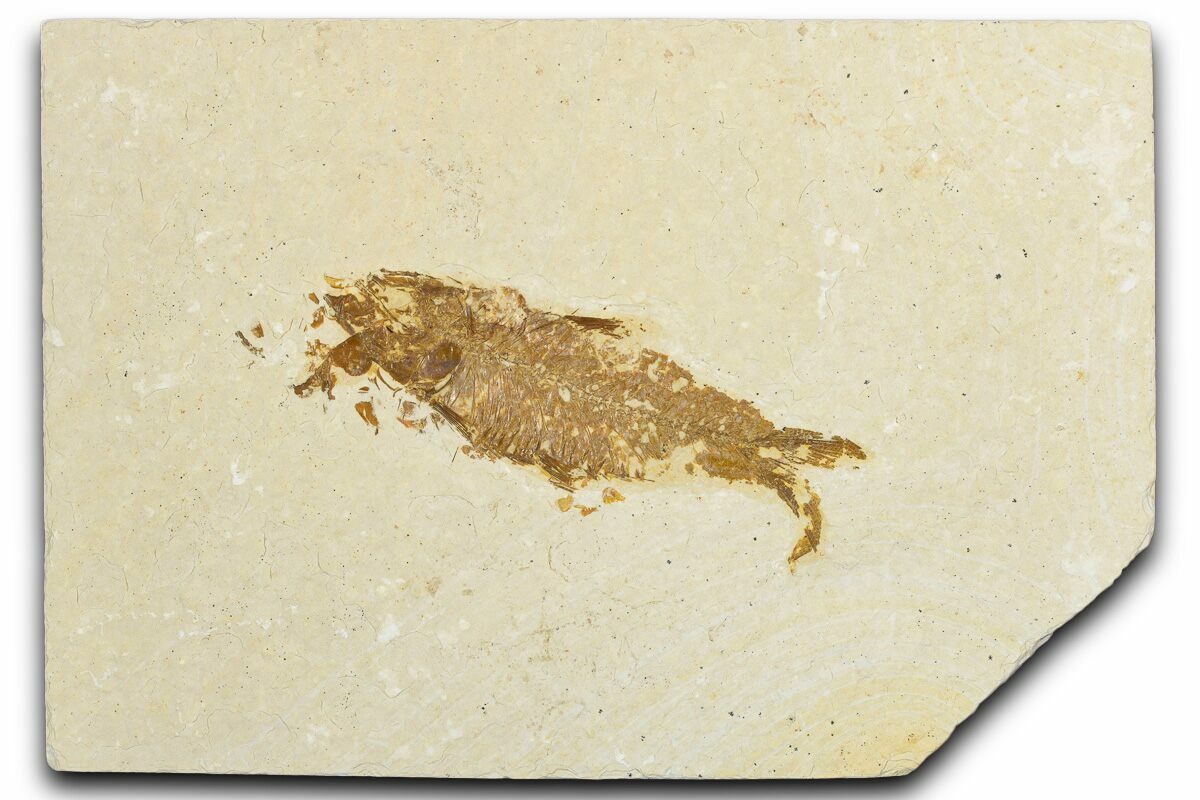 This is a detailed, 2.5" long fossil fish (Knightia eocaena) from our Fossil Lake Safari quarry near Kemmerer, Wyoming. There is a fault running through the rock which caused the front half of the fish to shift upwards slightly, hence the bargain price.