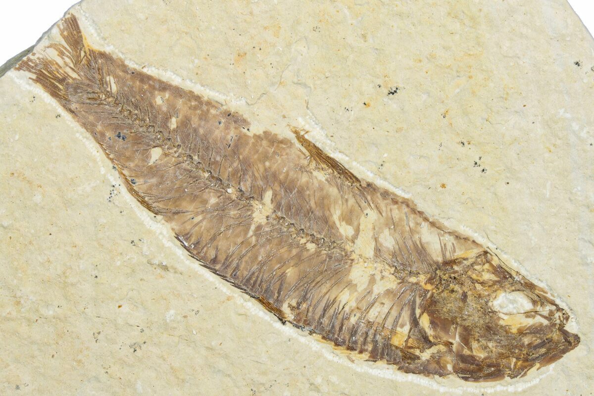 This is a detailed, 2.5" long fossil fish (Knightia eocaena) from our Fossil Lake Safari quarry near Kemmerer, Wyoming. The tail of this fish is running off the edge of the rock, hence the reduced price.