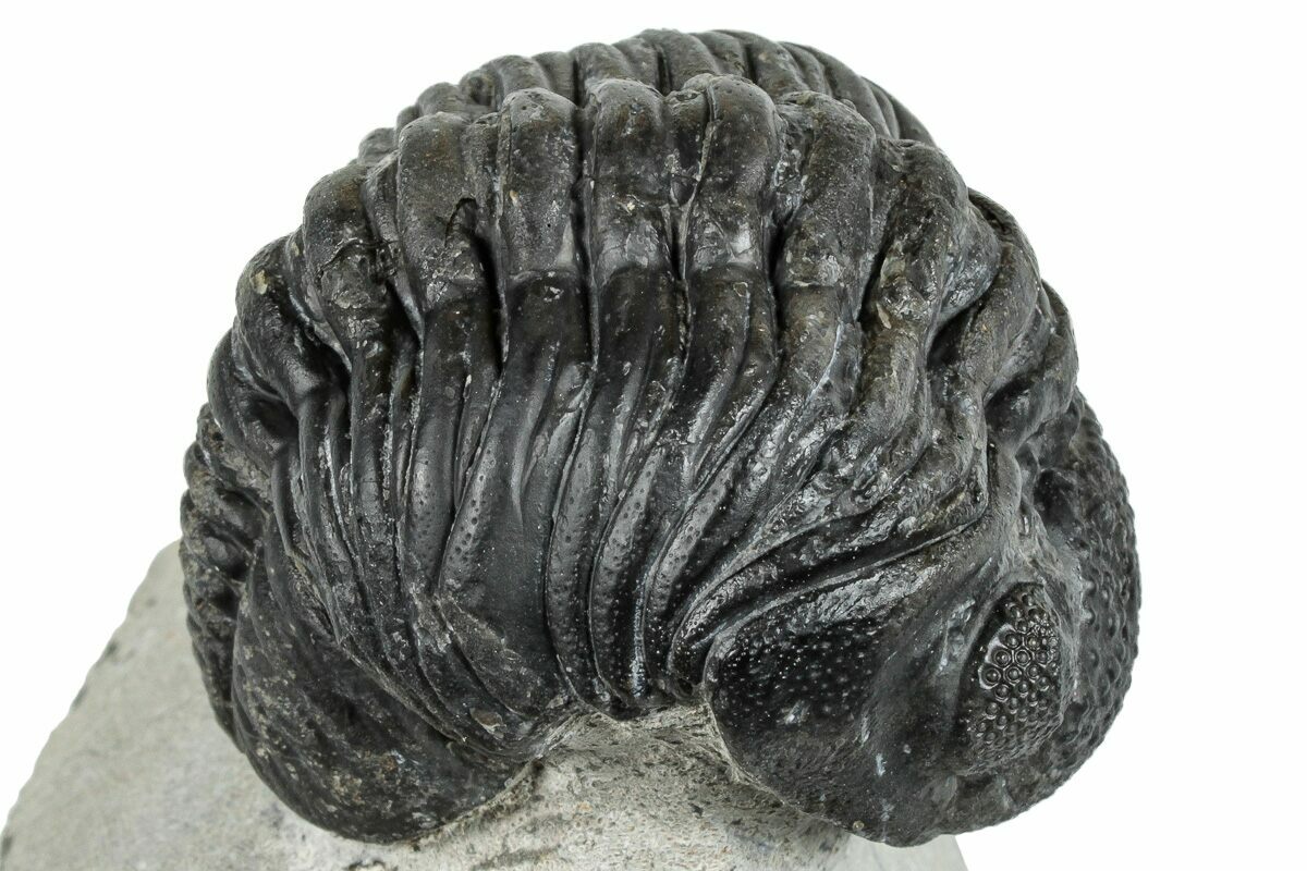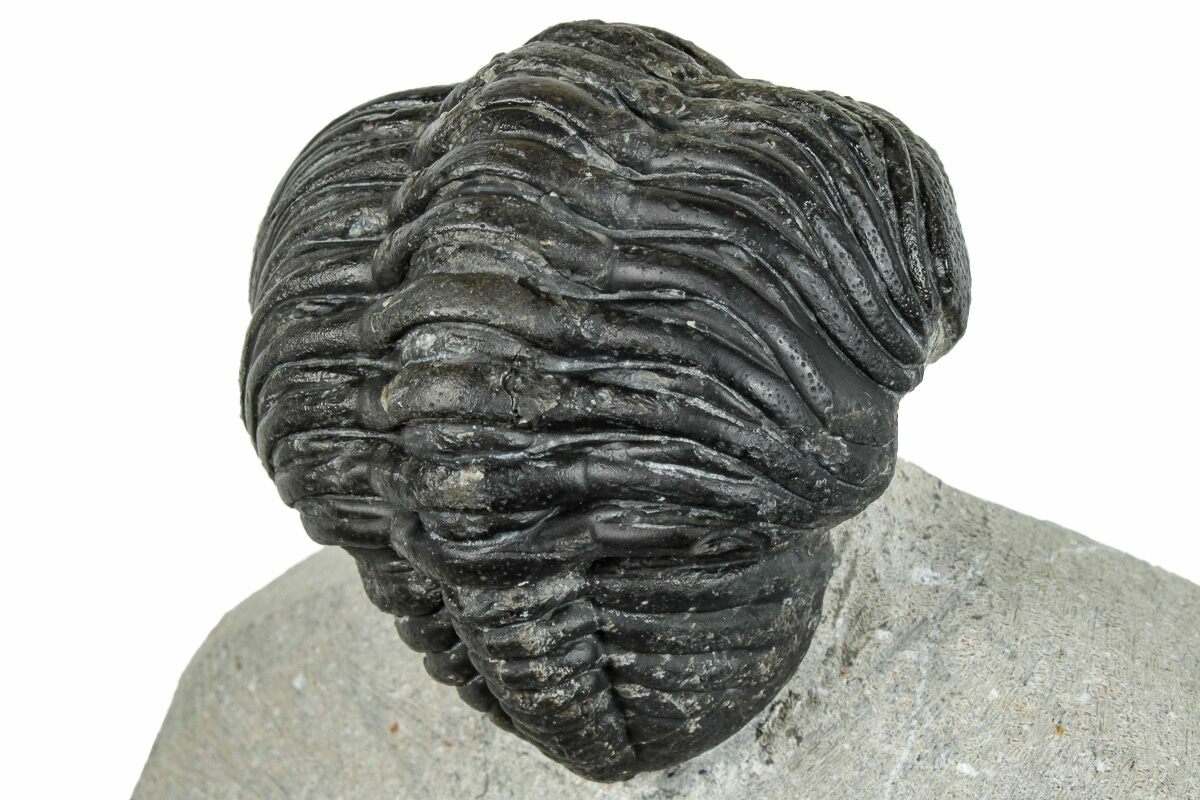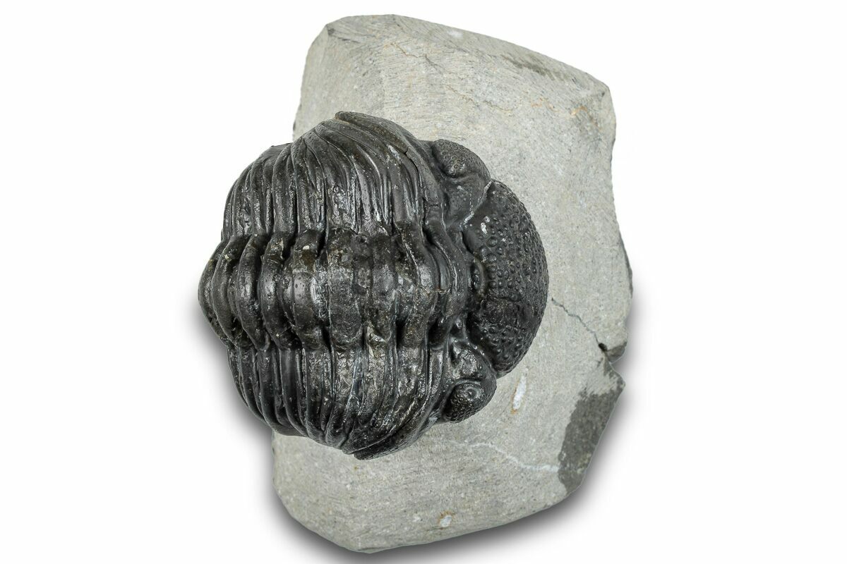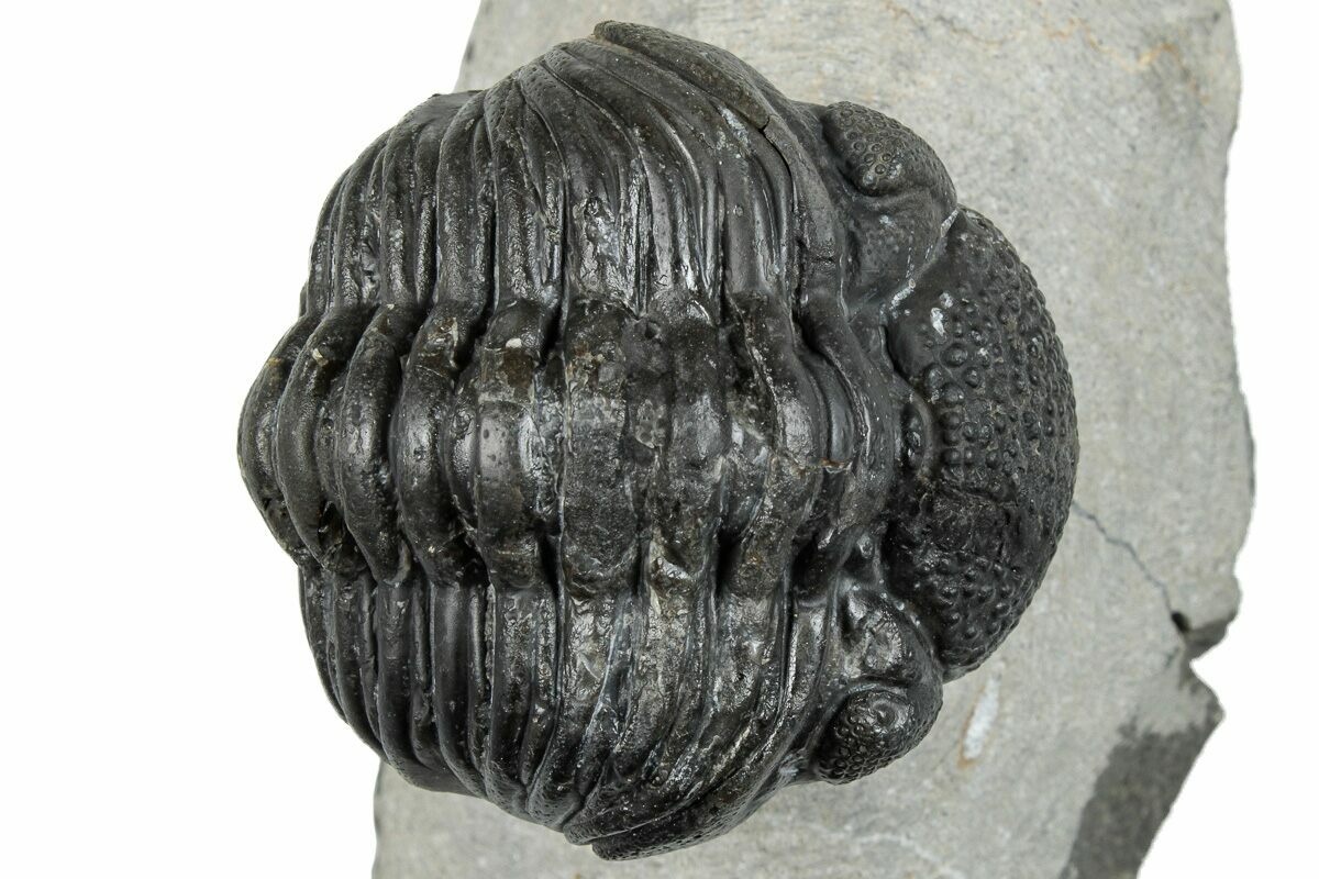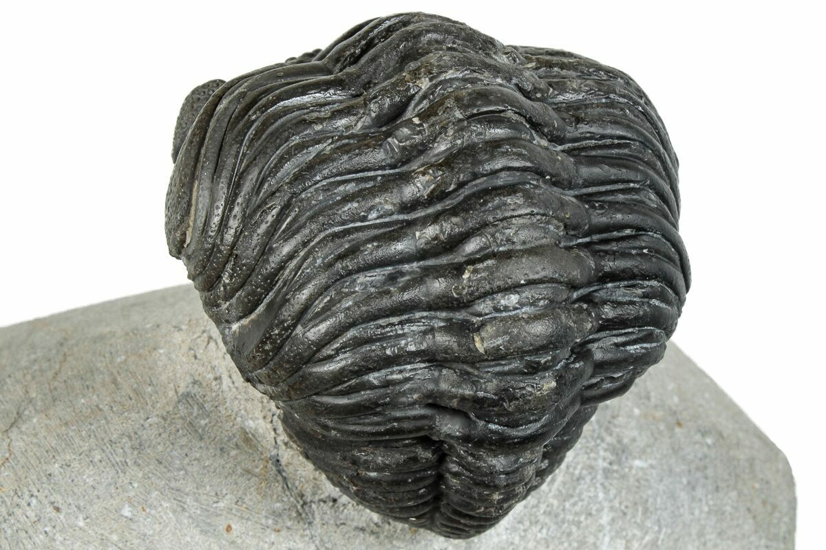 This is a curled, 2.55" long (if outstretched) specimen of Pedinopariops vagabundus from Mrakib, Morocco. The limestone around it has been removed, leaving it nicely displayed on a section of limestone. About 4-5% restoration to this specimen along repaired cracks. It's likely the pygidium has been composited from another trilobite.