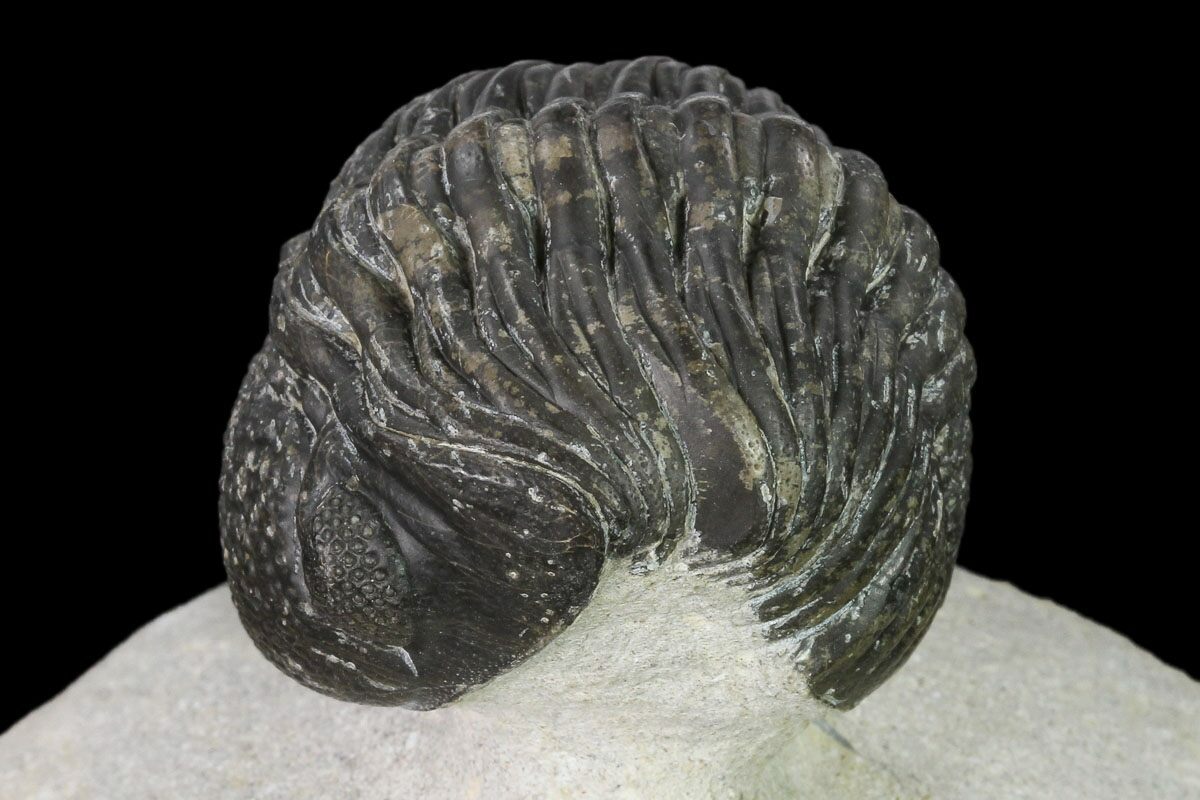 This is a 2.7" long ((if outstretched) specimen of Pedinopariops (Hypsipariops) vagabundus from Mrakib, Morocco. Nice eye facet detail in both of the eyes.