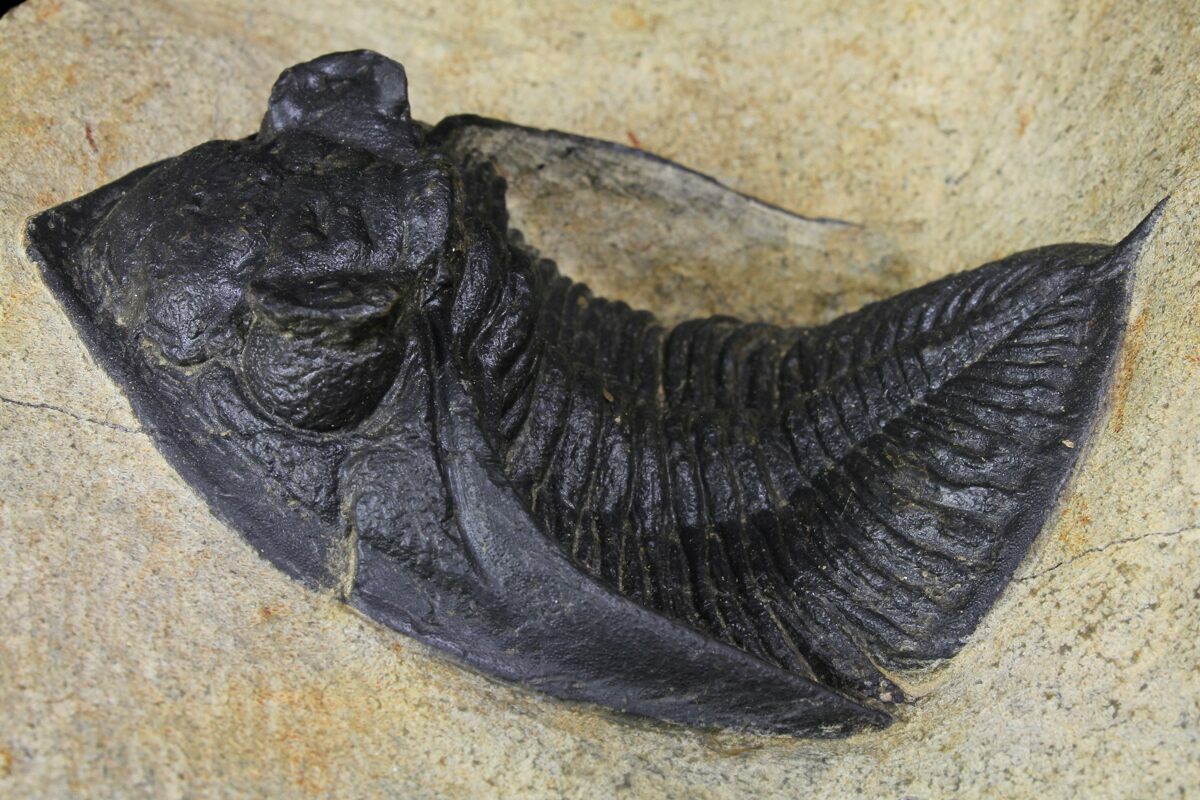 This is a bargain, 2.7" long specimen of Zlichovaspis rugosa from Atchana, Morocco. There is also a Reeedops trilobite partially exposed next to it. The preparation is a bit rough in areas, hence the bargain price.