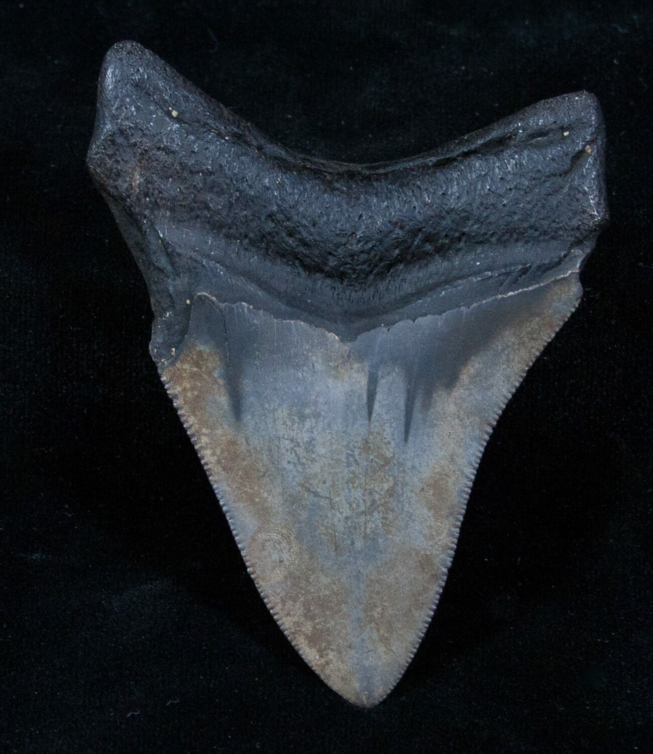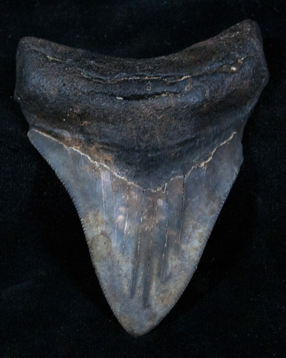 This 3.33" long, tooth from the prehistoric, mega-shark, the Megalodon. It is a black-water, river find from the SE United States, likely Georgia. It's missing a small section on the left hand side but is in otherwise good shape. The serrations on both edges are still sharp like the blade of a steak knife.