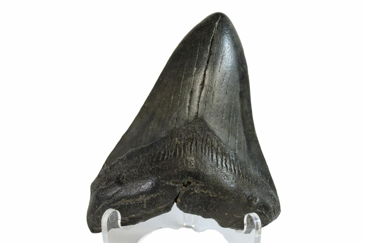 The standard measure for megalodon teeth is slant height, or the longest edge of the tooth. Adult megalodon teeth were typically in the 4 to 5 inch range: teeth over 6 inches are rare and represent super-sized individuals. Only a handful of teeth have ever been found over seven inches.