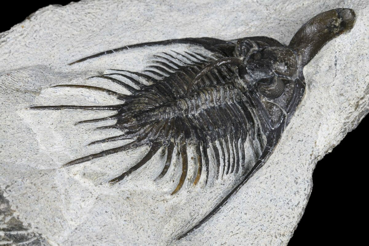 This is a bargain, 3" long Psychopyge elegans trilobite collected from the Tazoulait Formation at Issoumour, Morocco. This species has a odd rostrum coming off the front of its head whose purpose is still up for debate. This specimen is bargain priced because most of the tiny spines that line its thorax are missing and quite a few of the pleural spines are restored. At also appears to have been remounted on the rock, possibly having been round ventral.