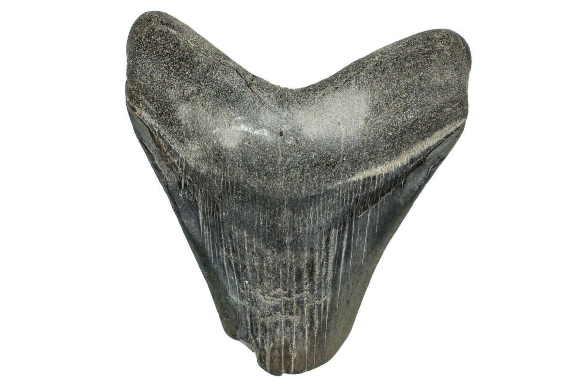 The standard measure for megalodon teeth is slant height, or the longest edge of the tooth. Adult megalodon teeth were typically in the 4 to 5 inch range: teeth over 6 inches are rare and represent super-sized individuals. Only a handful of teeth have ever been found over seven inches.