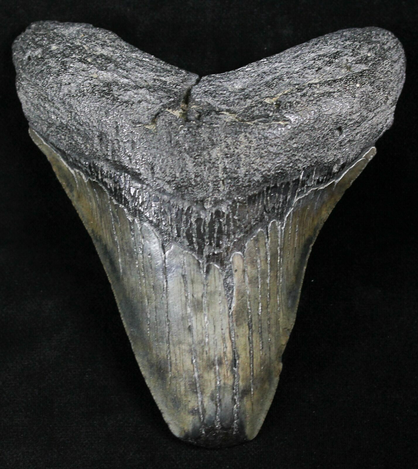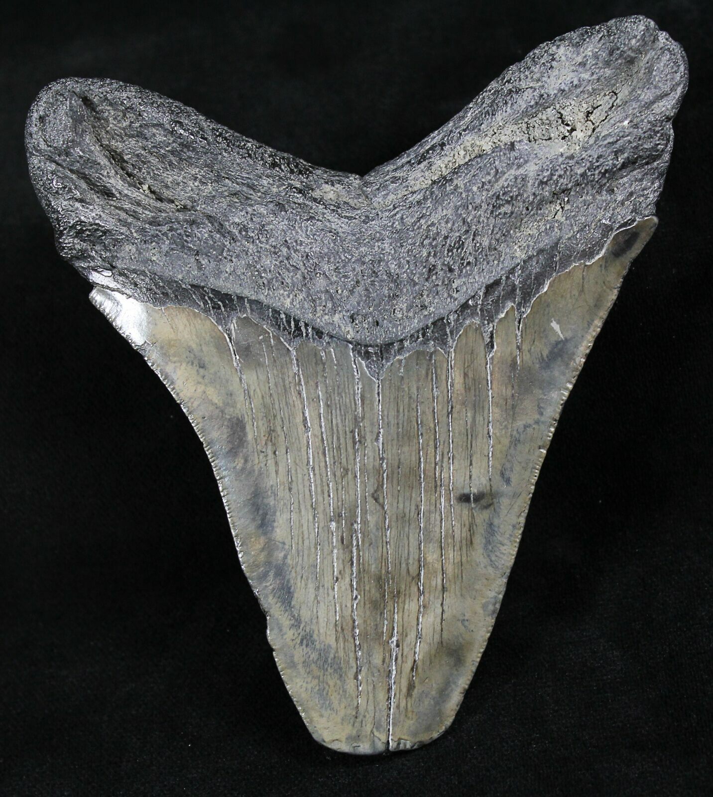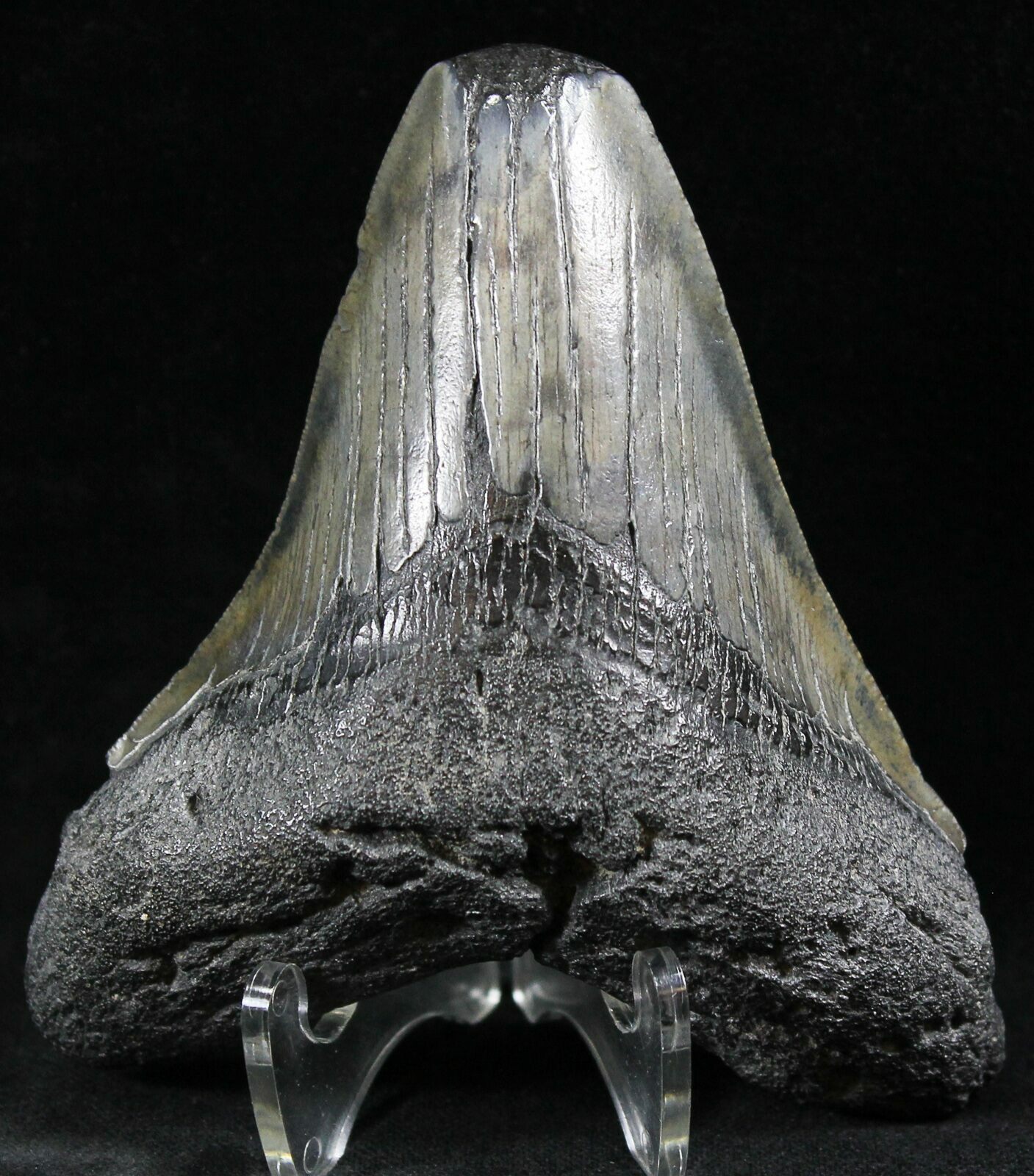The standard measure for megalodon teeth is slant height, or the longest edge of the tooth. Adult megalodon teeth were typically in the 4 to 5 inch range: teeth over 6 inches are rare and represent super-sized individuals. Only a handful of teeth have ever been found over seven inches.