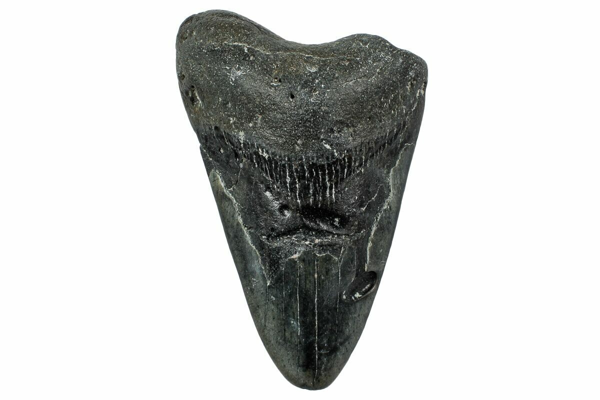 This is a bargain, 4.58" long fossil Megalodon tooth collected from a river in South Carolina. The tooth would have come from an adult, prehistoric, mega-shark in the 35+ foot size range.