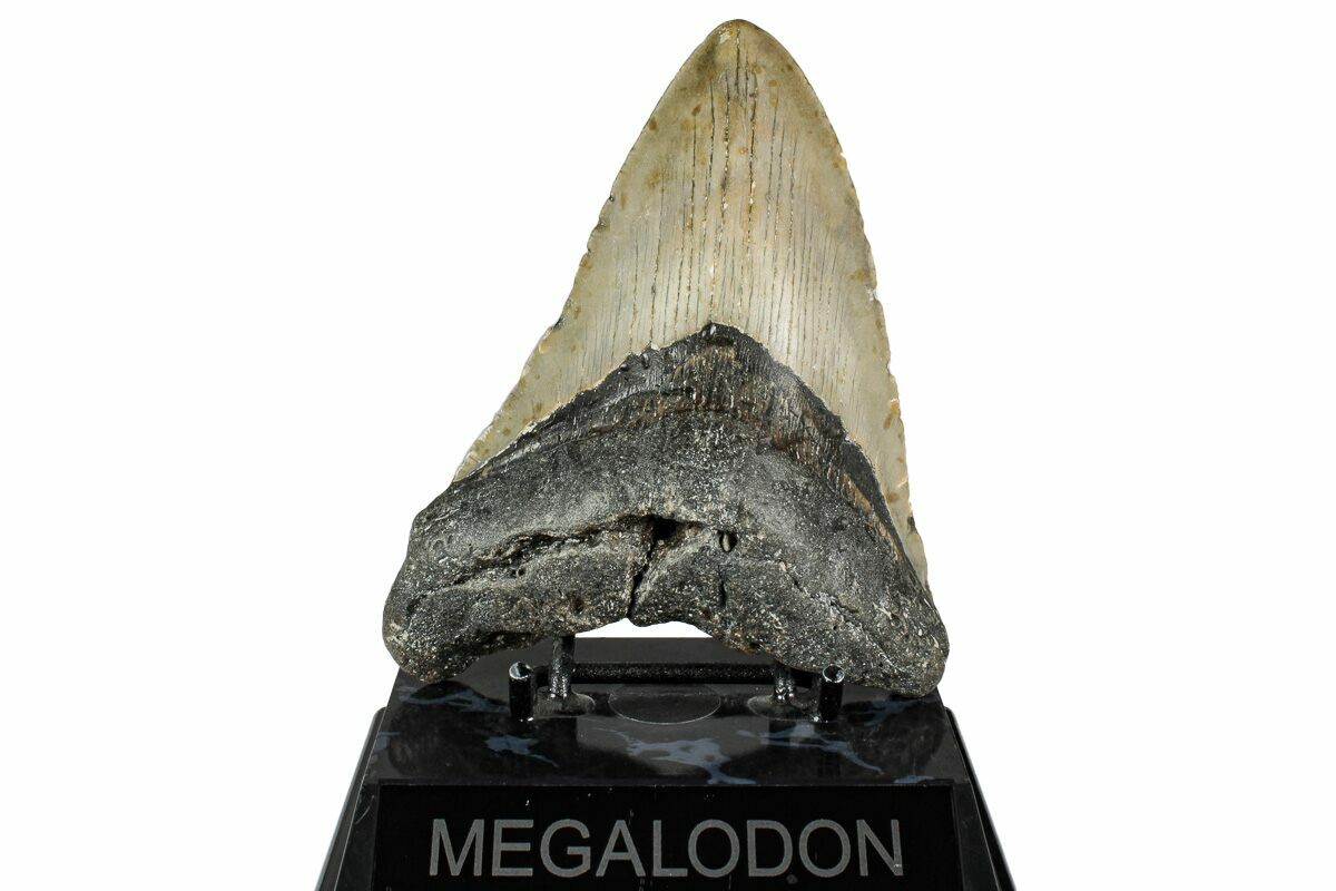 This is a large, 5.05" long megalodon tooth collected on the North Carolina coast. It was found by commercial divers collecting "the ledges" in about 100 feet of water. It would have eroded out of the Pungo River Formation putting its age in the range of 13.8 to 16 million years old. A tooth of this size would have come from a prehistoric mega-shark in the 40 foot size range.