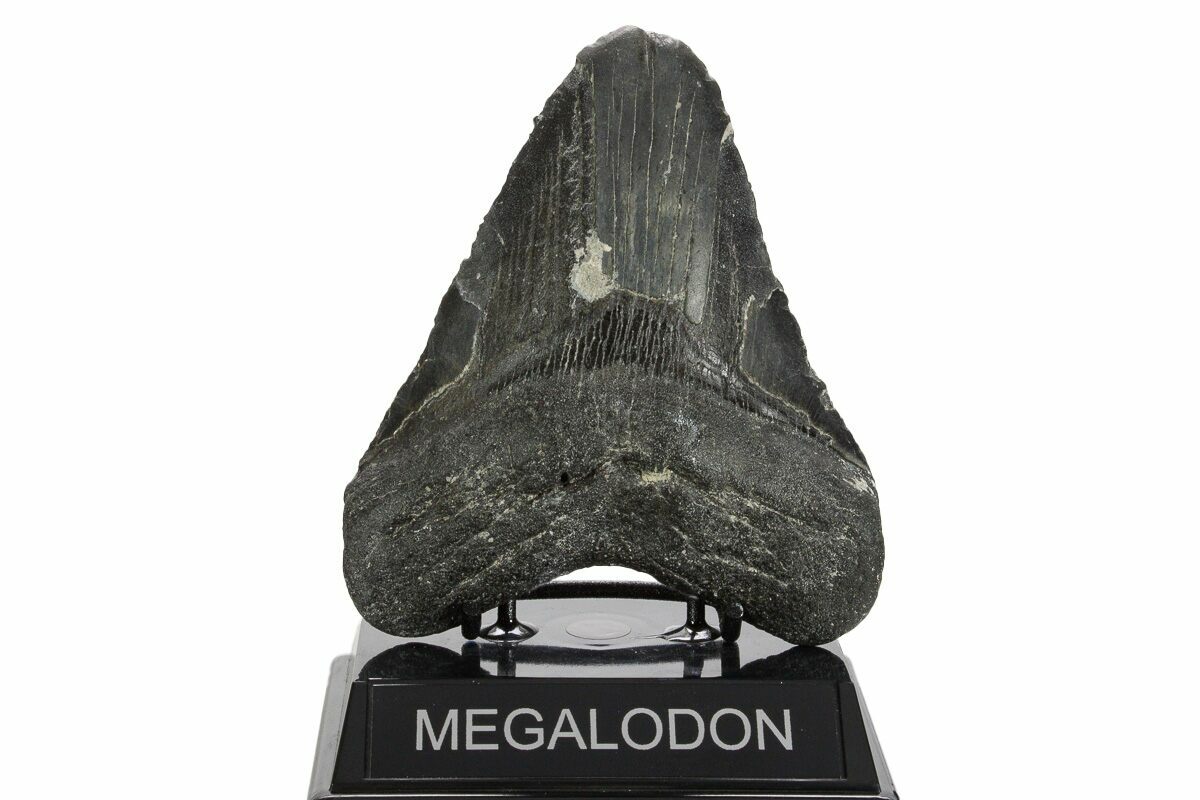 The standard measure for megalodon teeth is slant height, or the longest edge of the tooth. Adult megalodon teeth were typically in the 4 to 5 inch range: teeth over 6 inches are rare and represent super-sized individuals. Only a handful of teeth have ever been found over seven inches.