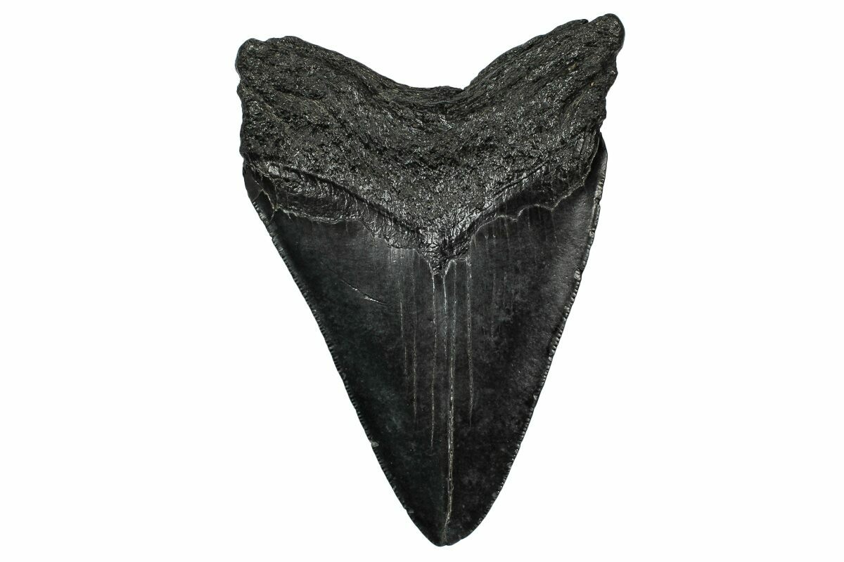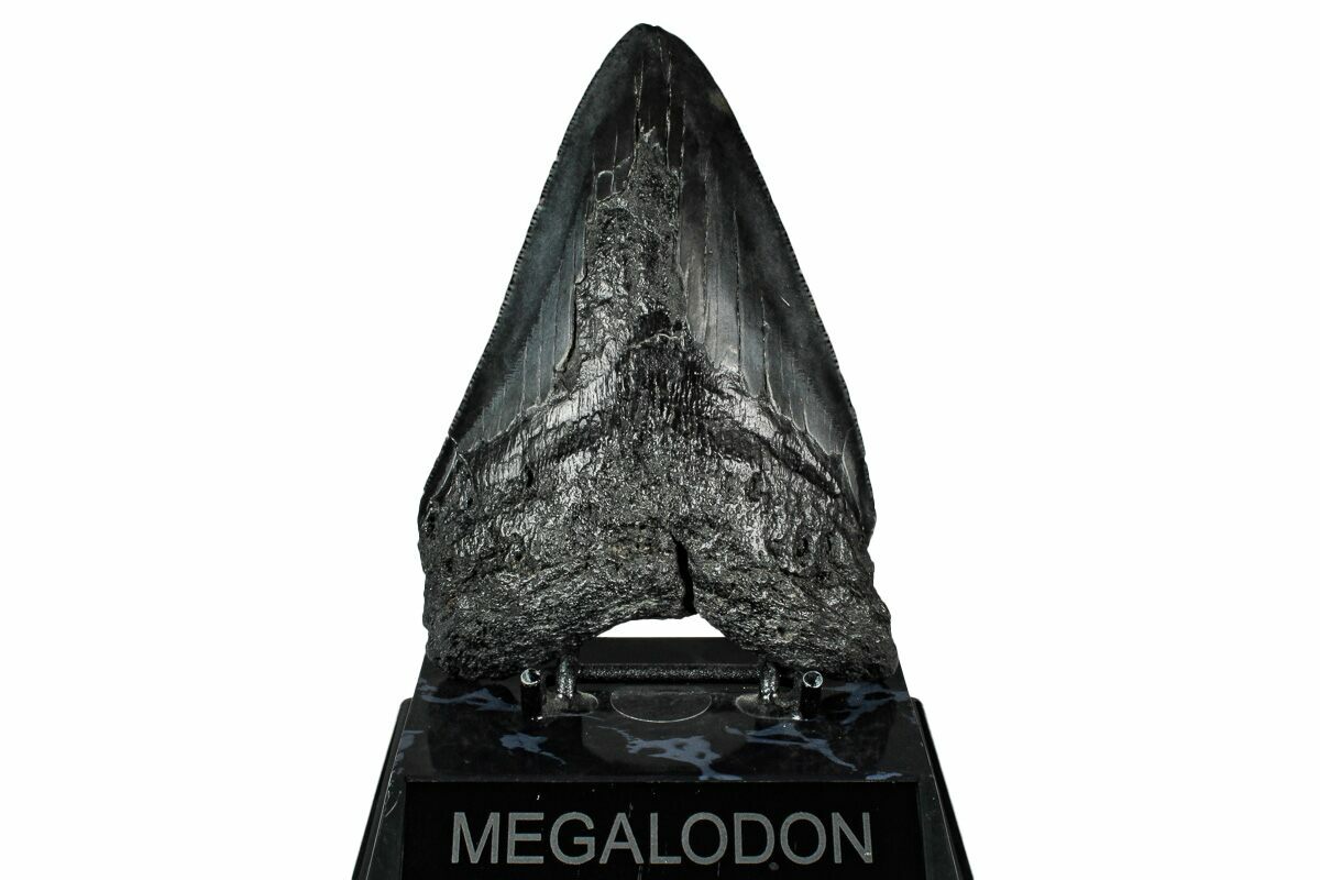 The standard measure for megalodon teeth is slant height, or the longest edge of the tooth. Adult megalodon teeth were typically in the 4 to 5 inch range: teeth over 6 inches are rare and represent super-sized individuals. Only a handful of teeth have ever been found over seven inches.