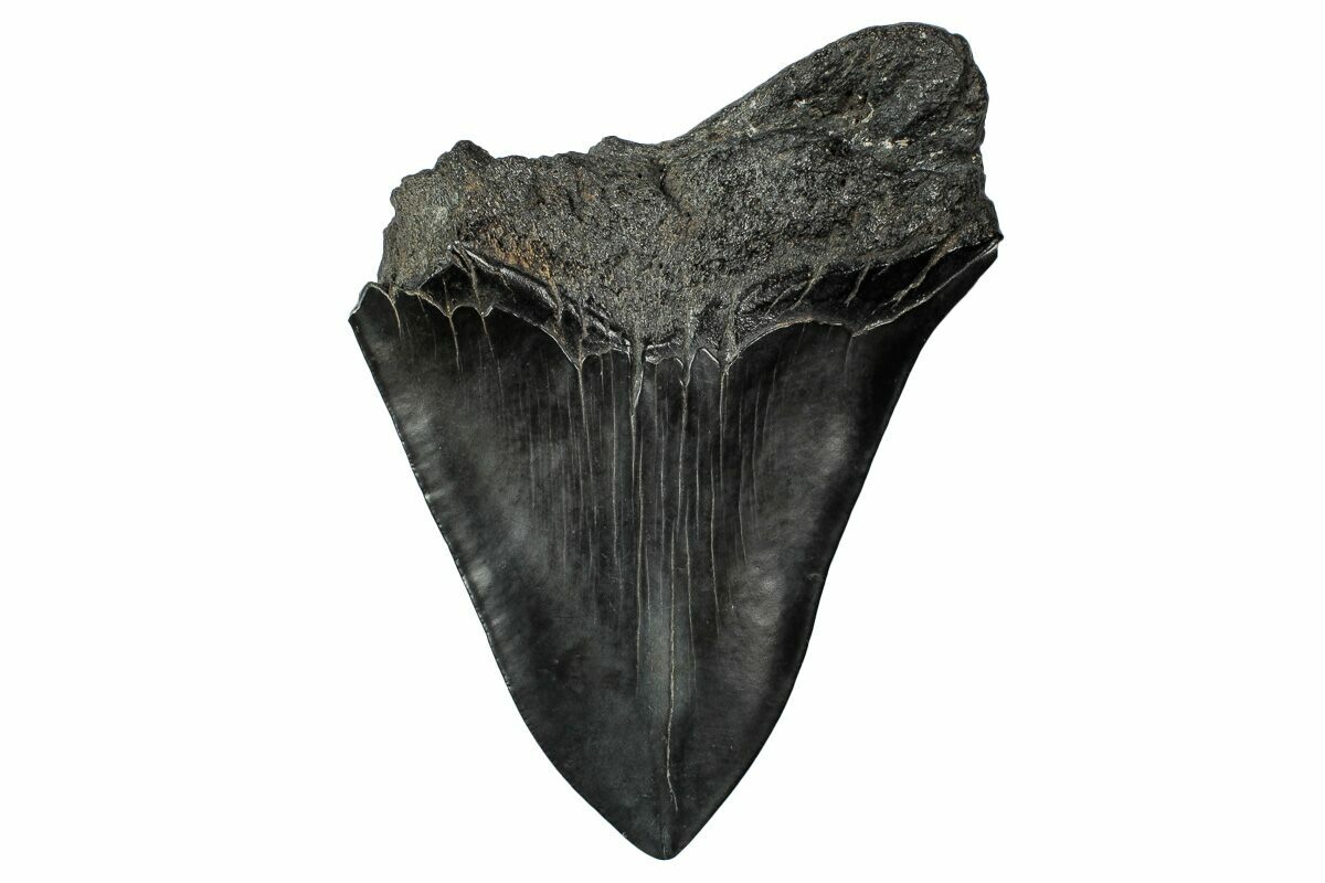 The standard measure for megalodon teeth is slant height, or the longest edge of the tooth. Adult megalodon teeth were typically in the 4 to 5 inch range: teeth over 6 inches are rare and represent super-sized individuals. Only a handful of teeth have ever been found over seven inches.