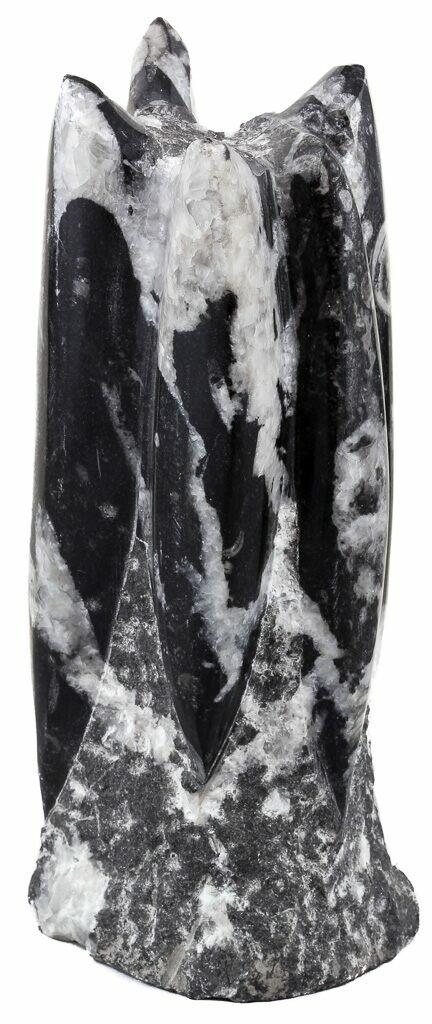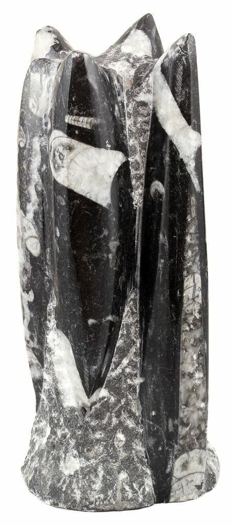 This is a 7.5" tall, tower made out of this fossiliferous rock. Areas where the larger Orthoceras fossils are located has been polished so that their chambered structure can easily be seen. The base is flat so that it stands up easily on it's own.