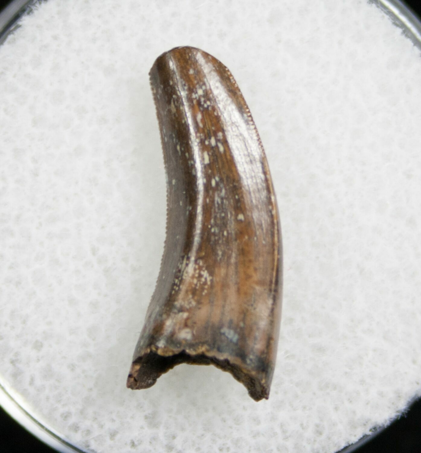 This is a small .72" long Nanotyrannus lancensis with beautiful enamel preservation and fine serrations. The tip is gone due to natural feeding damage to the tooth. It comes in an acrylic display case.