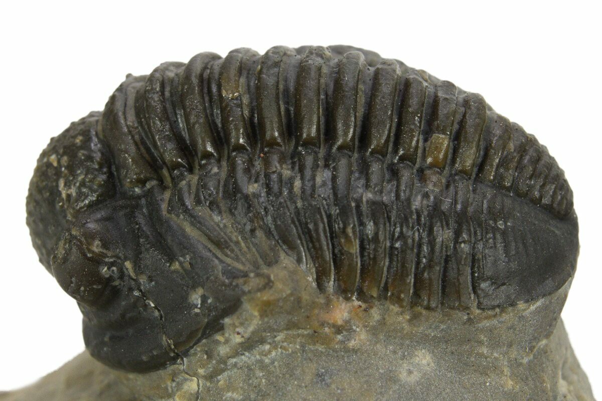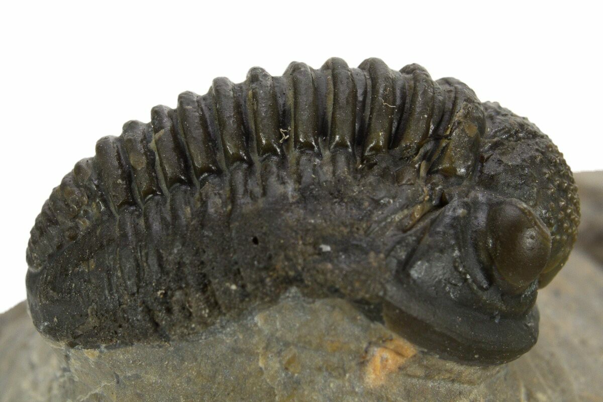 1This is a detailed, .75" long specimen of the proetid trilobite, Gerastos, collected from Issoumour, Morocco. This specimen has about 10% shell restoration along the right hand side of the thorax, hence the bargain price.