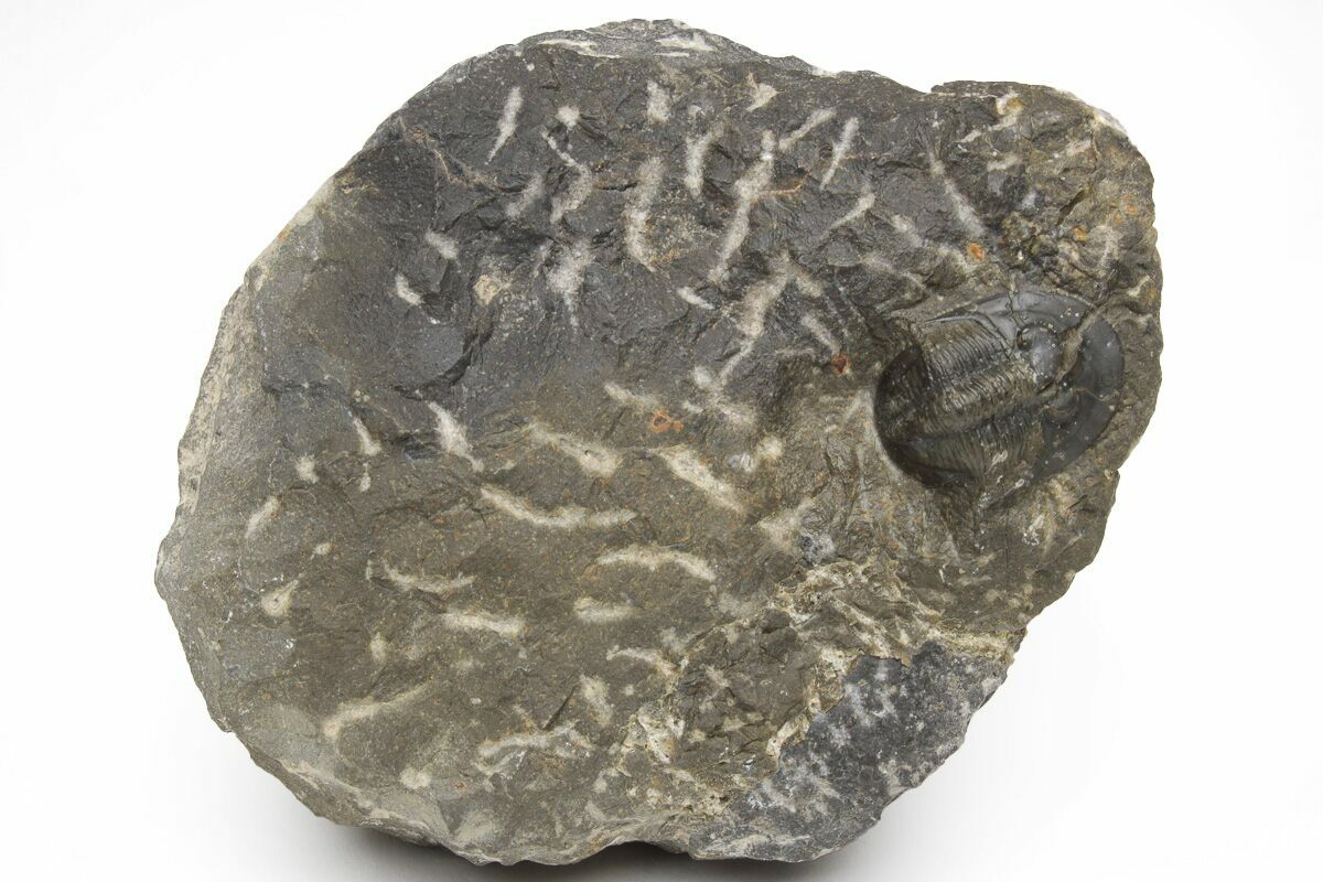 This is a bargain specimen of a fairly uncommon trilobite species from Issoumour, Morocco (Dechenella burmeisteri). The preparation is a bit rough, leaving some airscribe dings on the shell, hence the bargain price.