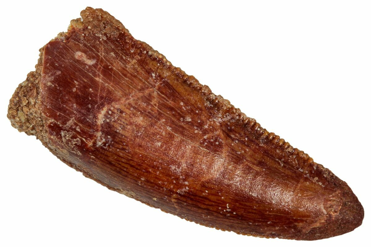 This is an authentic dinosaur tooth from the Late Cretaceous Kem Kem Beds (formerly Tegana Formation) of Morocco. These small theropod dinosaurs from the Tegana Formation have yet to be described, primarily due to a lack of articulated bone material found in the formation. That means it is impossible to provide a species or even genus ID from these teeth alone.