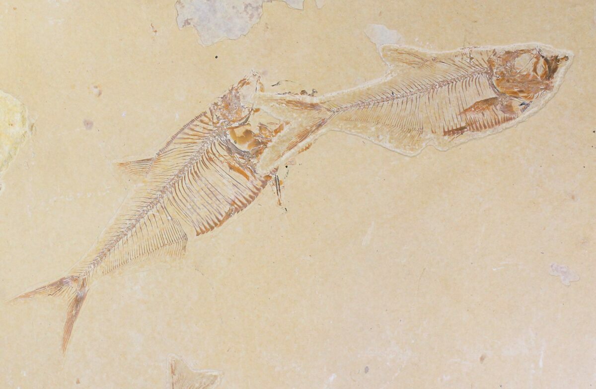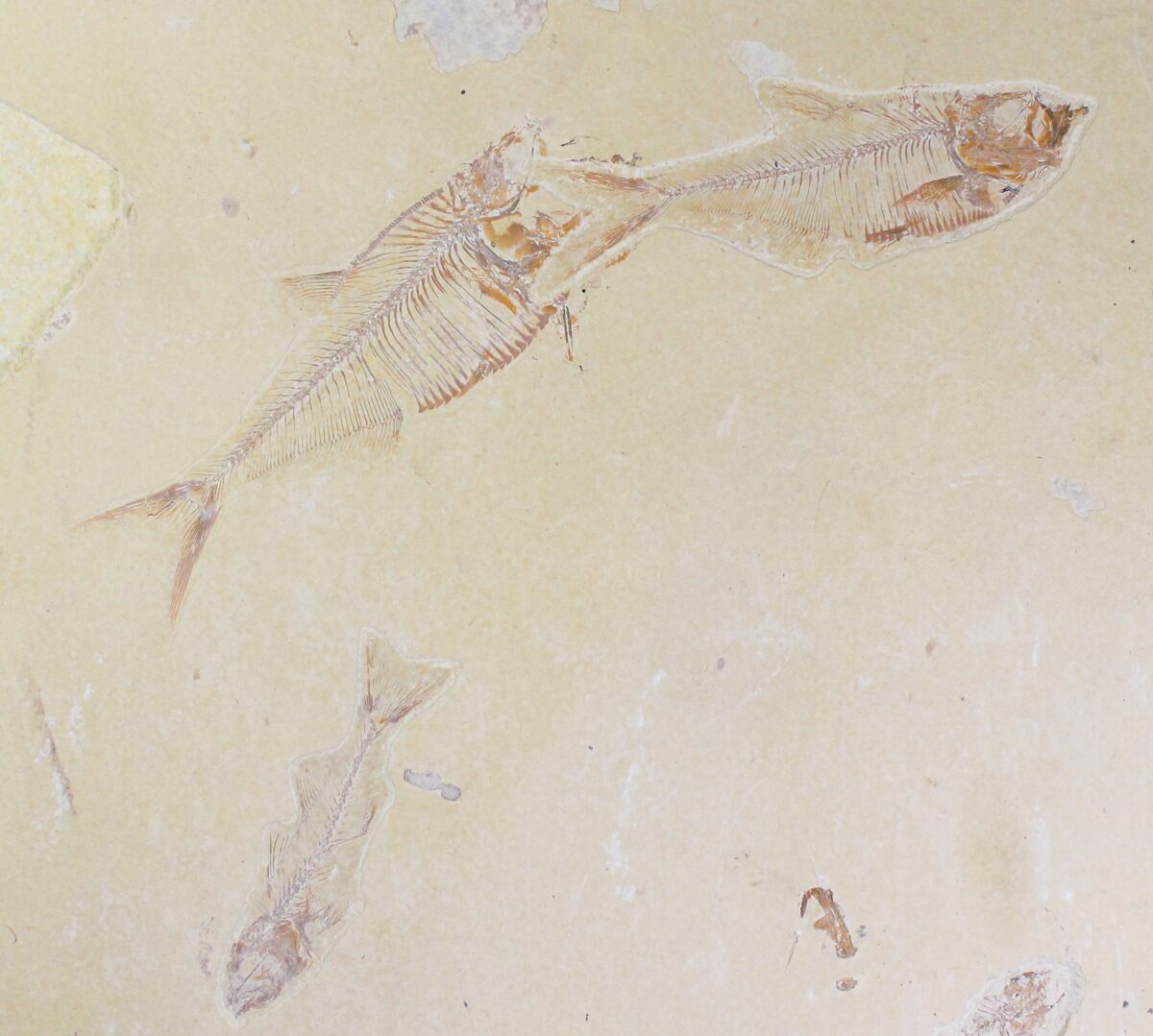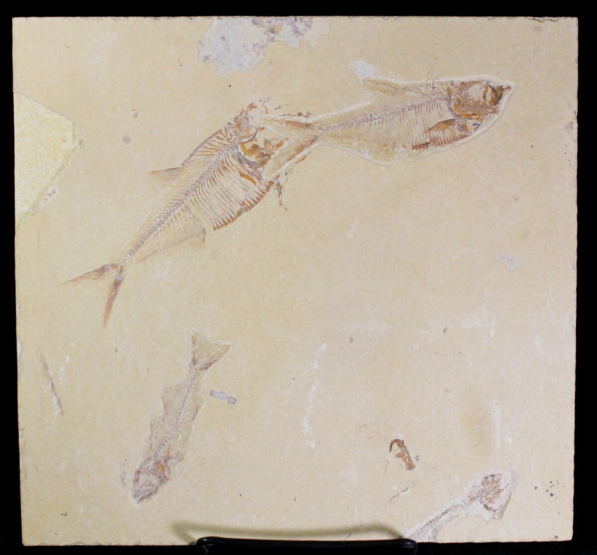 This 9.2x8" plate of shale from the Green River Formation contains four fossil fish of two different species. There are two Diplomystus dentatus, one complete Knightia eocaena, and a second partial Knightia eocaena. The largest fish is 4.6" long and the rock is about 3/4" thick. Comes with a display stand.