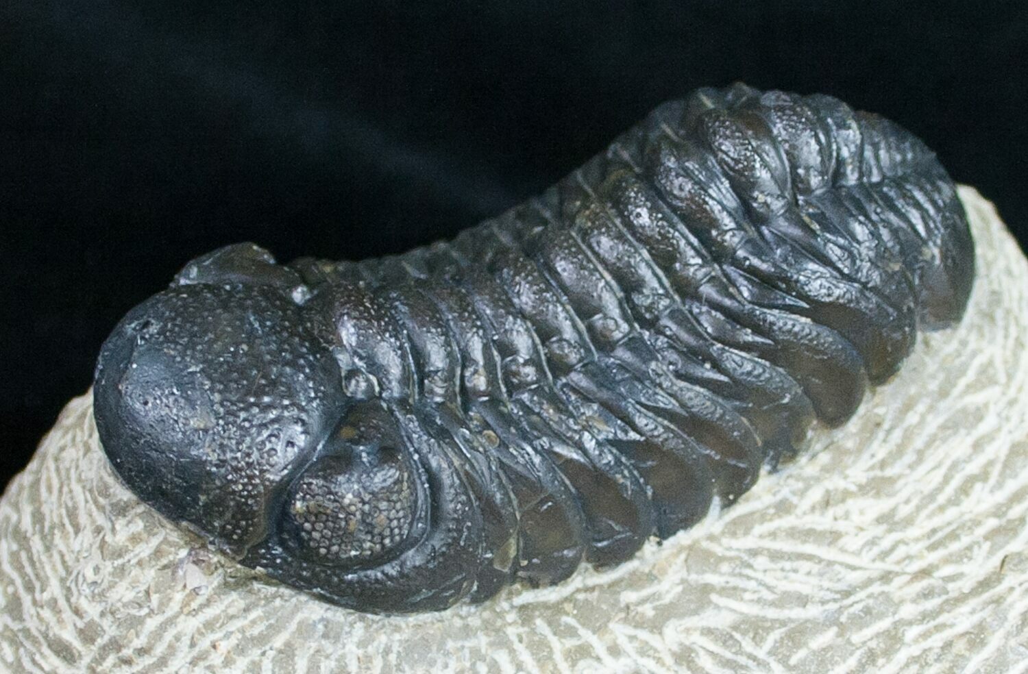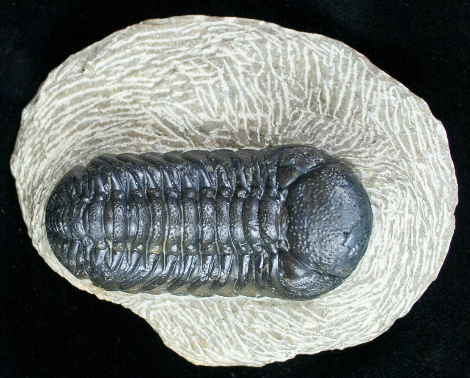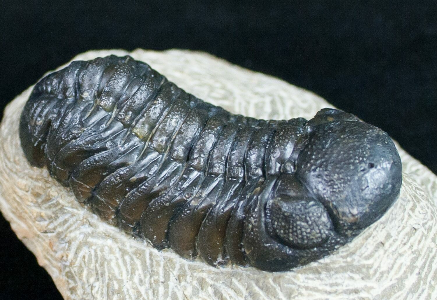 This is a bargain Phacops trilobite from Issoumour, Morocco. It's reversed flexed and is a little over 2 inches long. It's well inflated and all of the eye facets and bumps covering it's shell can easily be seen. There is about 3% shell restoration on this trilobite.