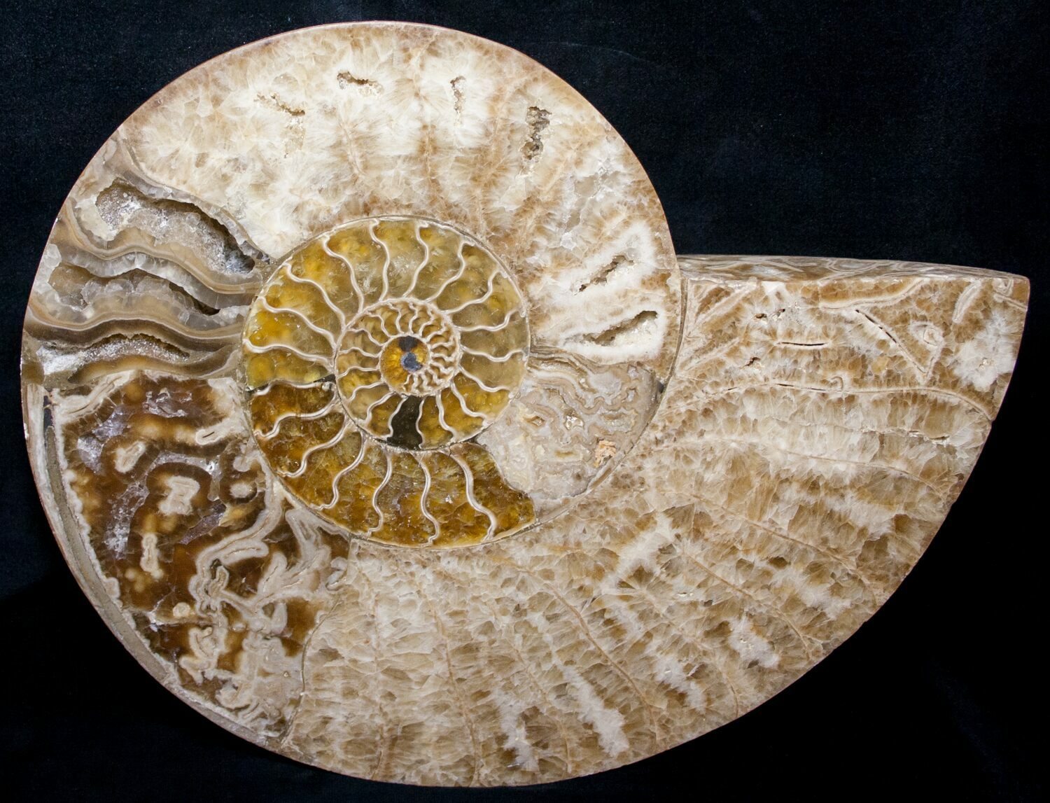 This is an massive example of a rarely seen ammonite from Madagascar. It is of the genus Choffaticeras, 10.8 inches wide, quite thick and the half weighs nearly 4 lbs. Ammonites of this genus are often referred to as Margarite or "Daisy" flower ammonites. It has been cut in half and polished to reveal the amazing inner detail. Several chambers have been preserved as deep, spectacular CRYSTAL LINED pockets. This is an extremely impressive ammonite specimen.