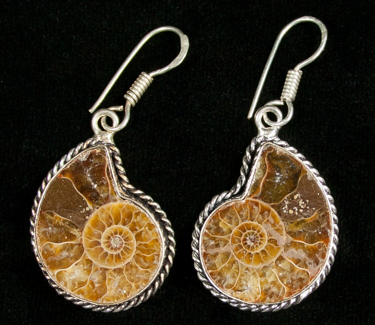 Here is a unique pair of earrings featuring a real, 110 million year old cut, and polished ammonite fossil from Madagascar.