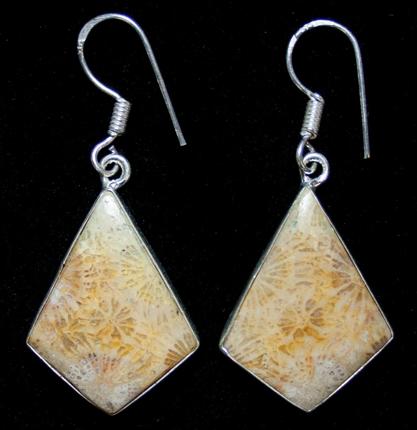 This is gorgeous pair of earrings made from agatized, fossil coral from Sumatra, Indonesia. The polishing allows the beautiful, fossilized structure of the coral heads to easily be seen.