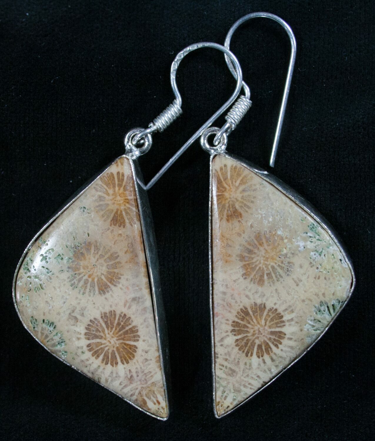 This is gorgeous pair of earrings made from agatized, fossil coral from Sumatra, Indonesia. The polishing allows the beautiful, fossilized structure of the coral heads to easily be seen.