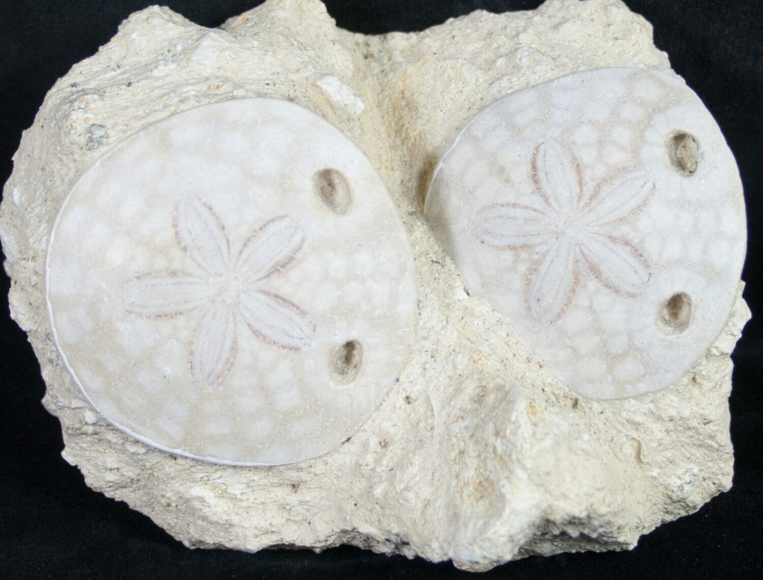 A sand dollar is a highly flattened form of urchin of the order Clypeasteroida. As an echinoderm, they have a pentameral (five-fold) symmetry to their body organization, a water vascular system, and an endoskeleton made of calcite plates. They live in shallow marine environments just below the low tide line, buried in the sand or mud. They range up to about 4 inches (10cm) in diameter. Most are about a third (7mm) to half (12mm) an inch thick, but some are over an inch thick. They are basically circular in shape, though some have flattened or indented sides. While alive, they are covered with velvety-looking spines that they use to move, much like other echinoderms. The most diagnostic indicator of fossil sand dollars is the five ovate form on the top side of the skeleton. These are part of the respiratory system and leave an easily identified “flower” on the skeleton. They are active predators, feeding on crustacean larvae, small copepods, diatoms, and algae.