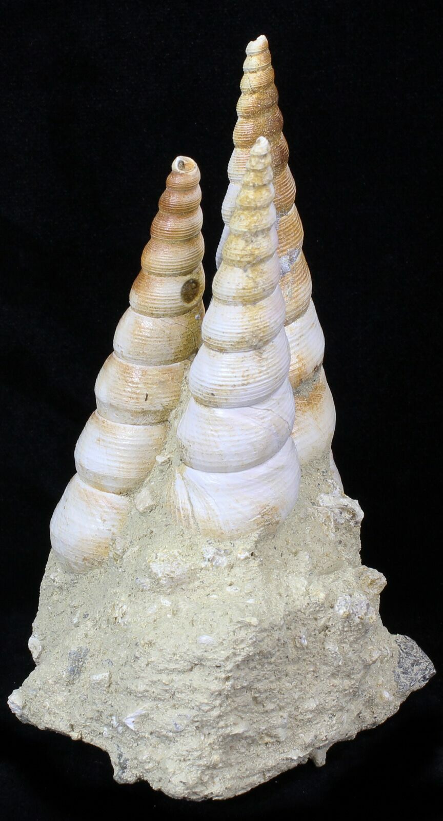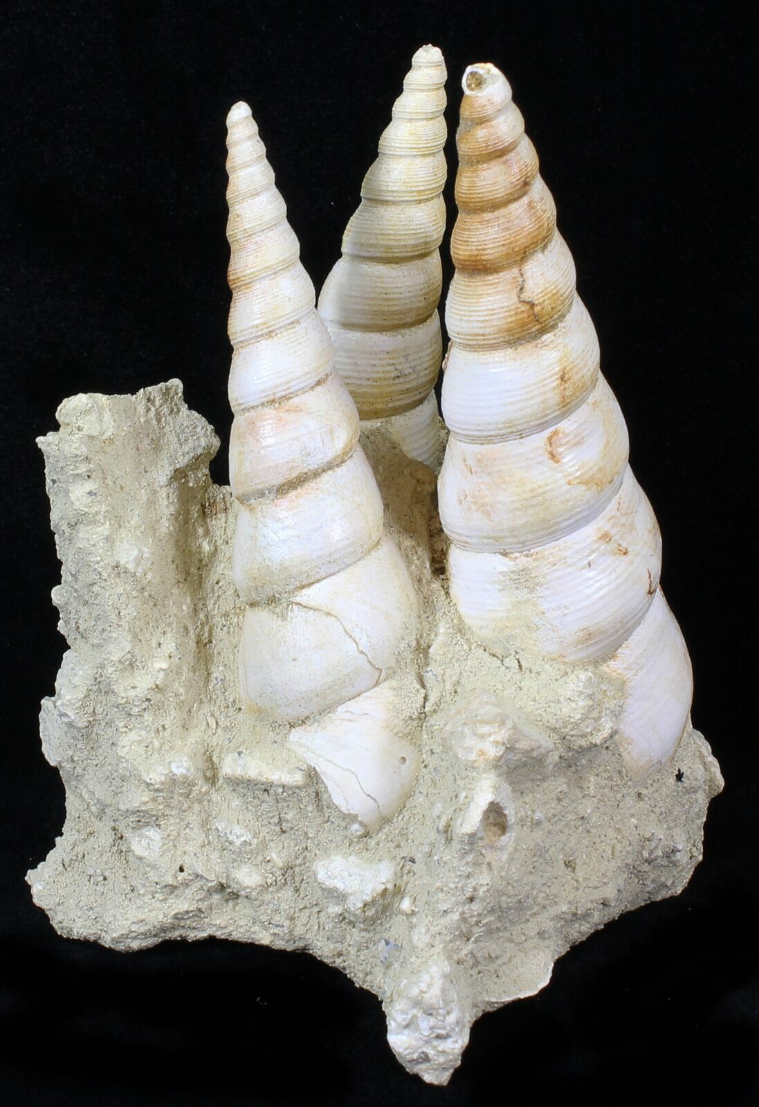 This is a block of sandstone containing a cluster of fossil Turritella (gastropods) and clams collected near Bordeaux, France. They are Early Miocene in age (Burdigalian Stage) so 16-20 milliion years old. The sandstone has been meticulously prepared to create a very aesthetic display piece.