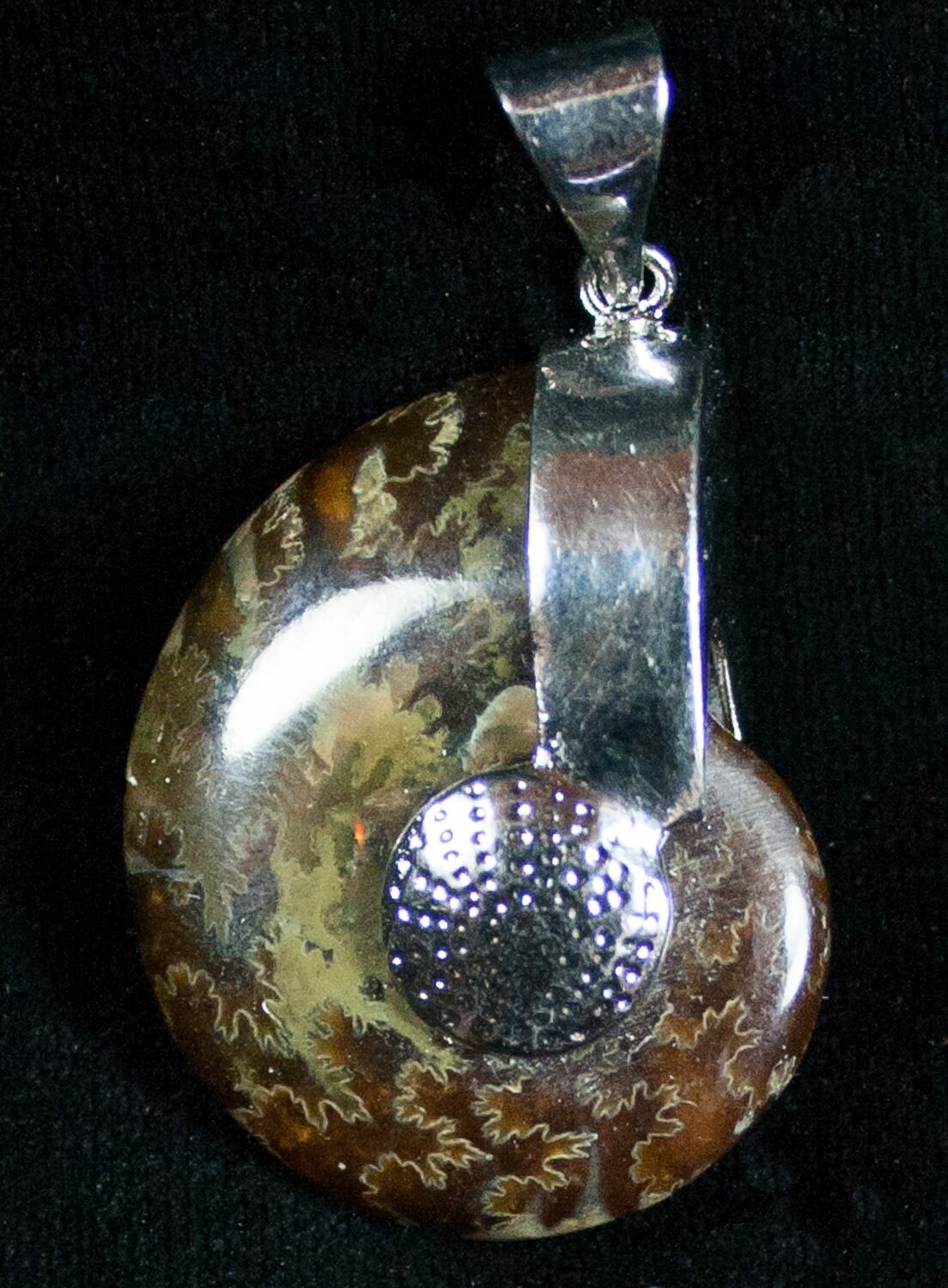 This is a pendant featuring an authentic, 110 million year old, polished ammonite fossil from Madagascar. The polished allows for the distinctive and beautiful suture pattern of the ammonite to be seen.