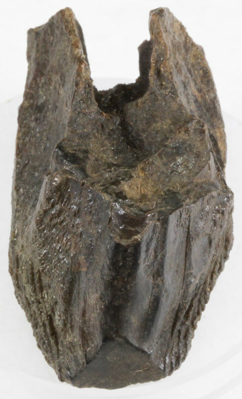 Here's a real tooth from one of the most iconic dinosaurs, Triceratops. It was collected in the 66 million year old, Hell Creek Formation of Montana. Triceratops had a massive battery of teeth in their mouth for chewing the rough vegetation that made up their diet. They shed these teeth during their lifetime and collectors often refer to these teeth as "spitters".