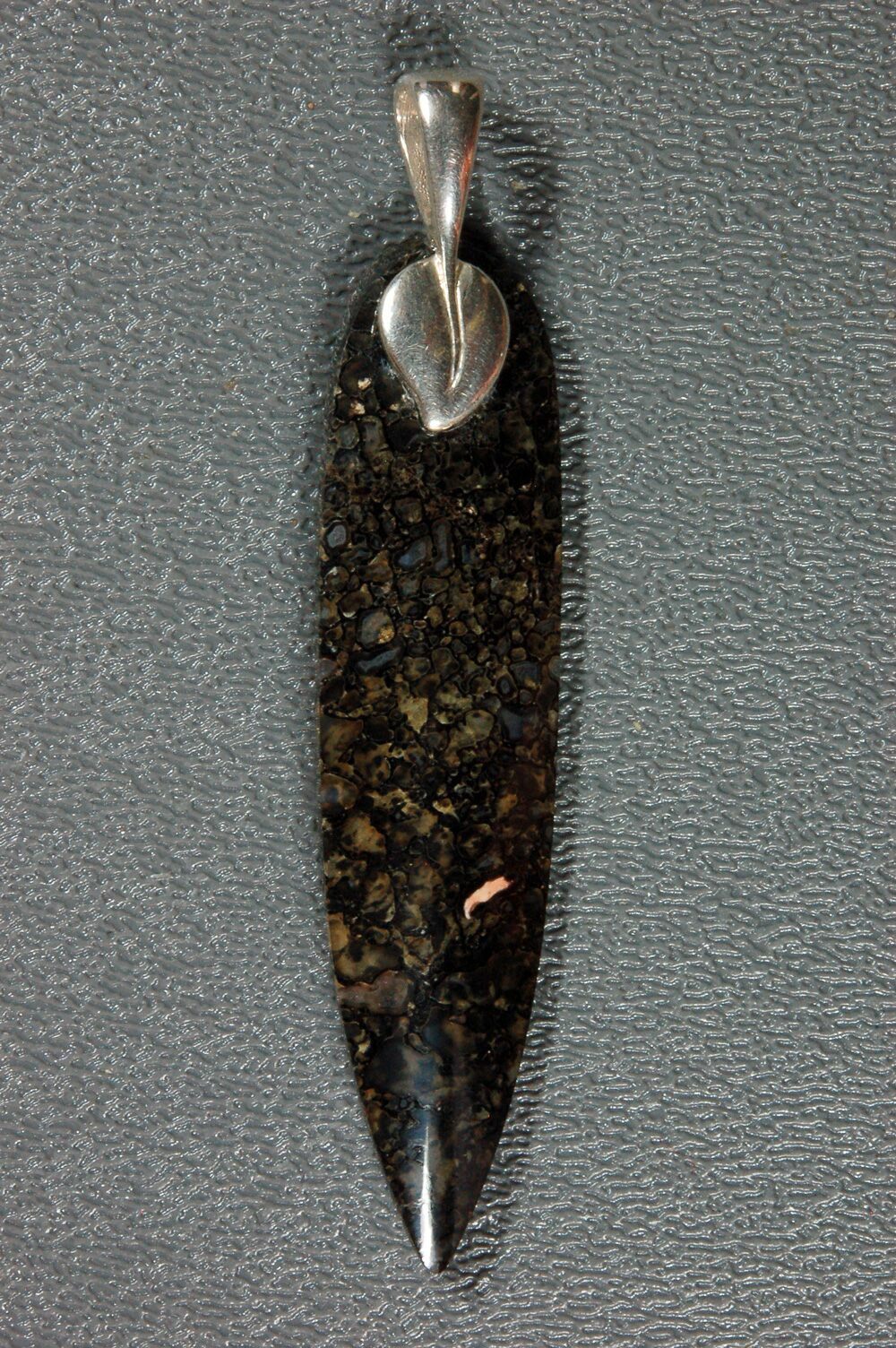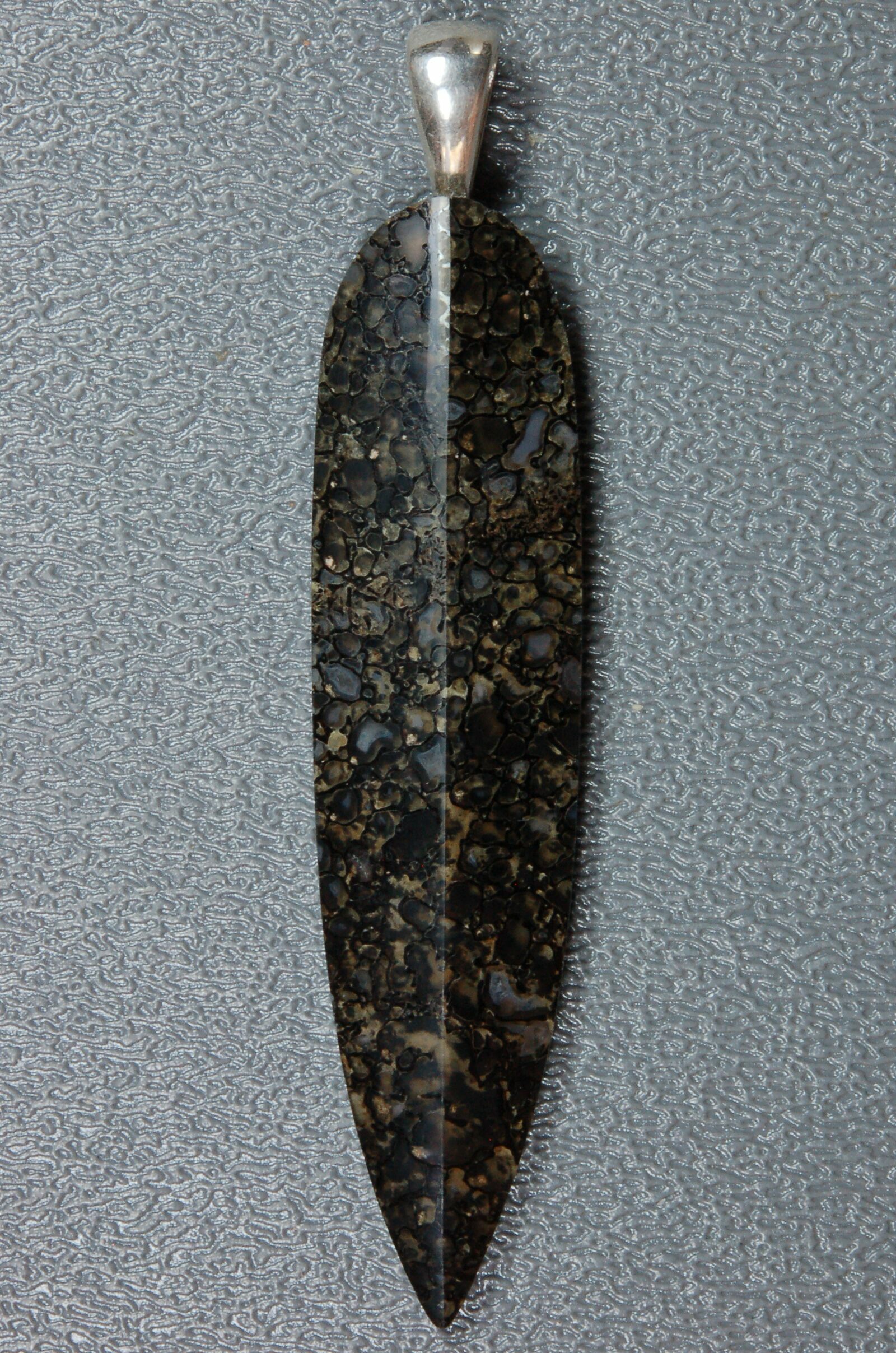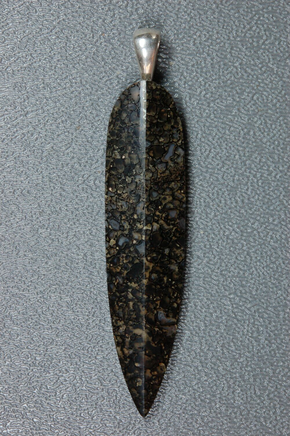 This is a gorgeous spear shaped pendant hand crafted from 150 million year old, agatized dinosaur bone (gembone) by master stone craftsman, Kenneth Kolb. The amazingly agatized cell structure of the bone creates a black spiderweb like with blue inclusions. This one of a kind pendant is 2 1/8" x 1/2" x 3/16" One side has a clearly defined ridge while the other has been polished flat.