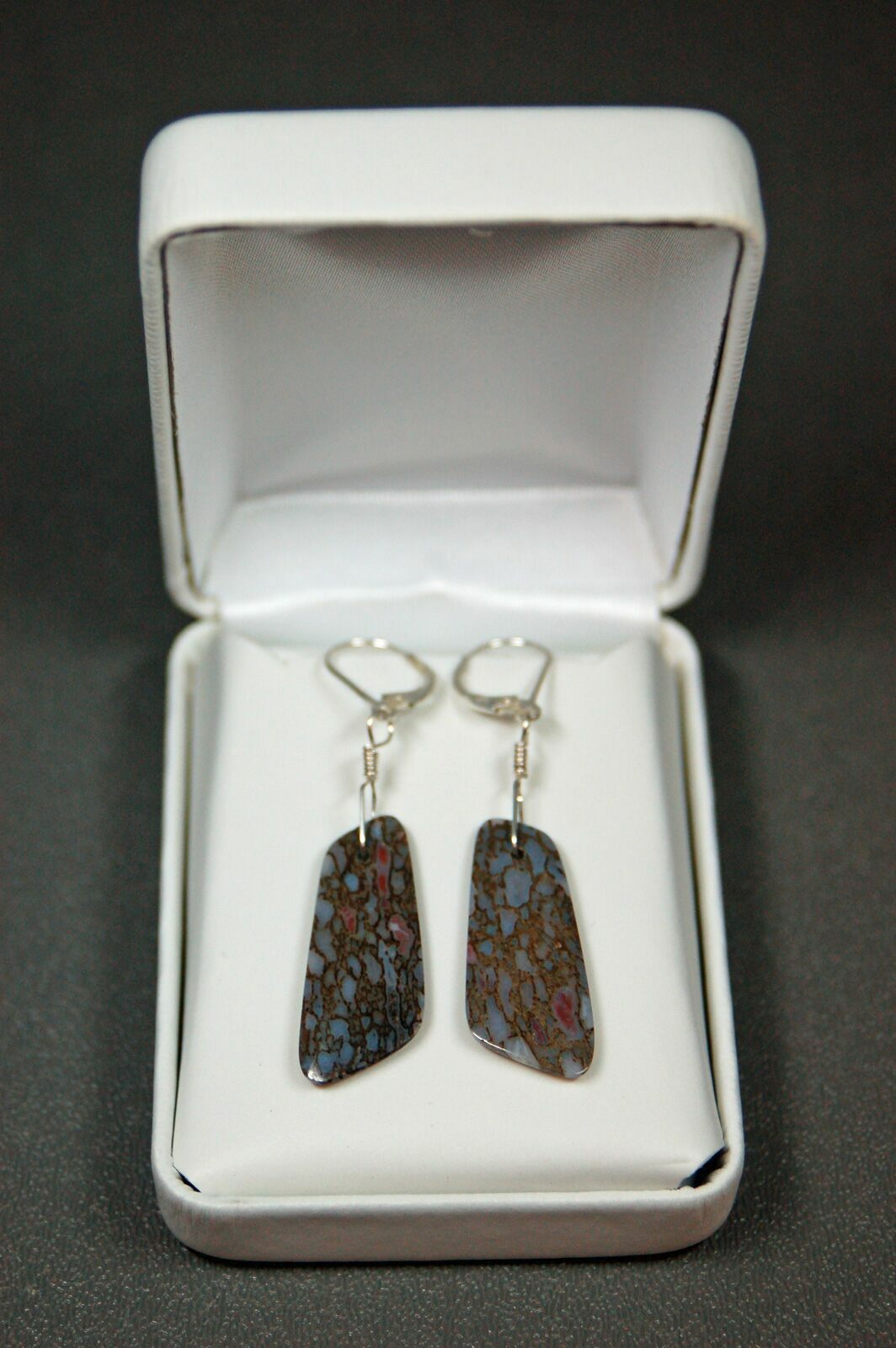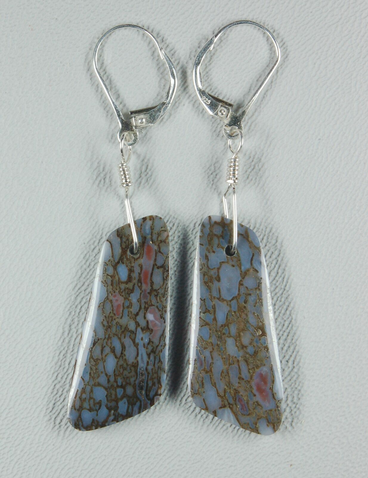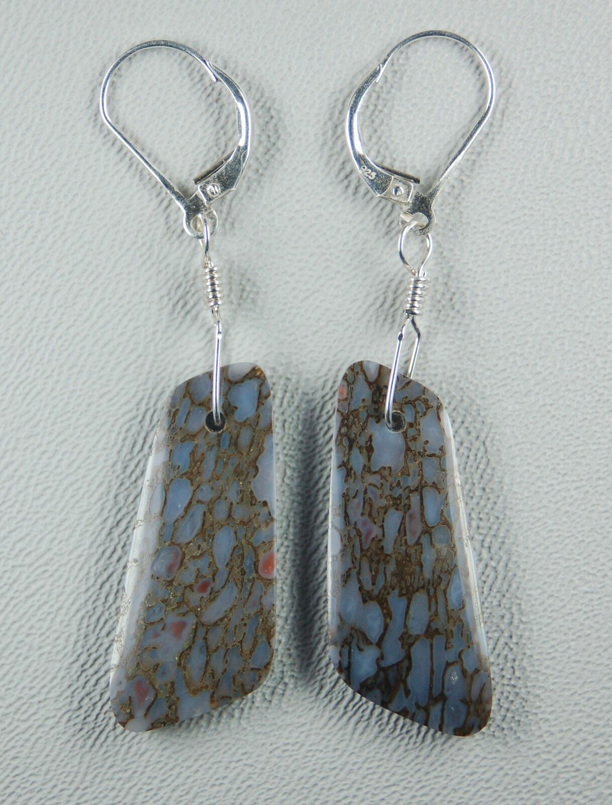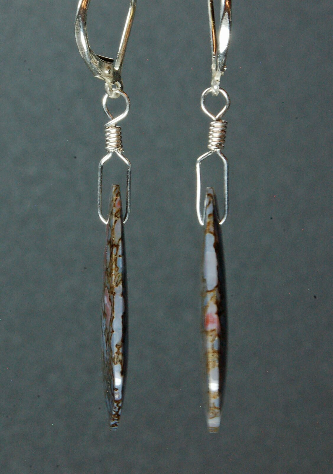 This is a pair of gorgeous trapezoidal earrings hand crafted from 150 million year old, agatized dinosaur bone (gembone) by master stone craftsman, Kenneth Kolb. The amazingly agatized cell structure of the bone creates beautiful, blue, green, black patterned appearance. These one-of-a-kind earrings are 1 1/8" x 1/2" x 1/8"