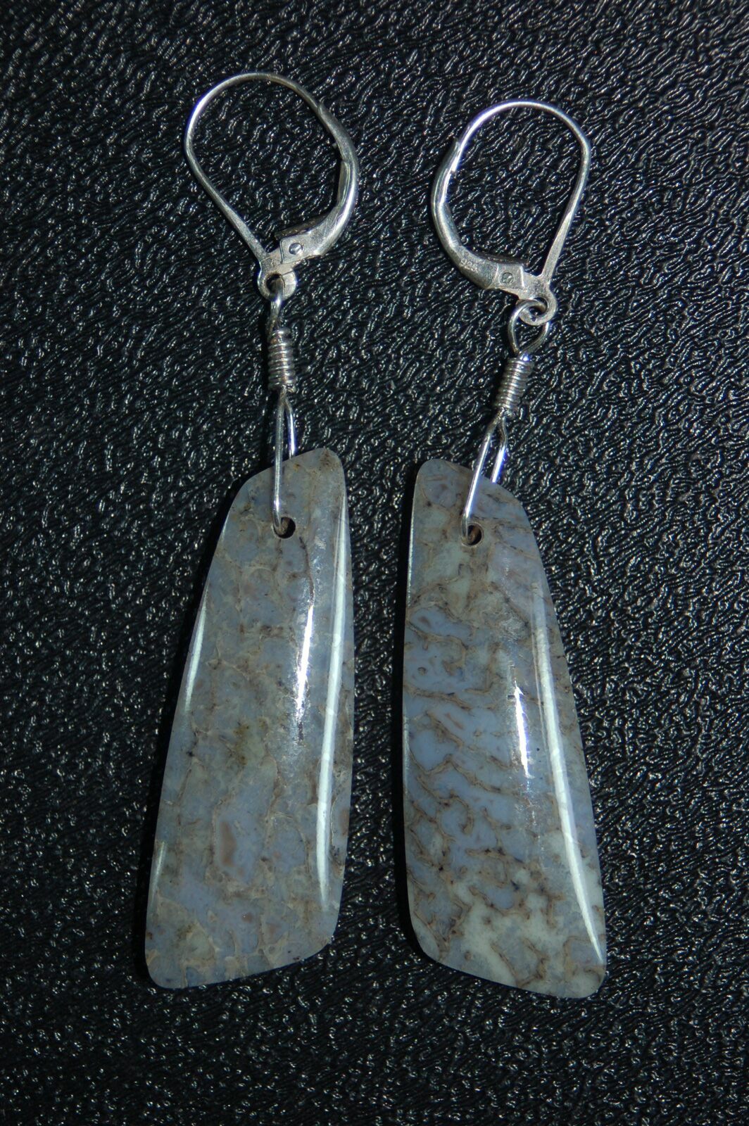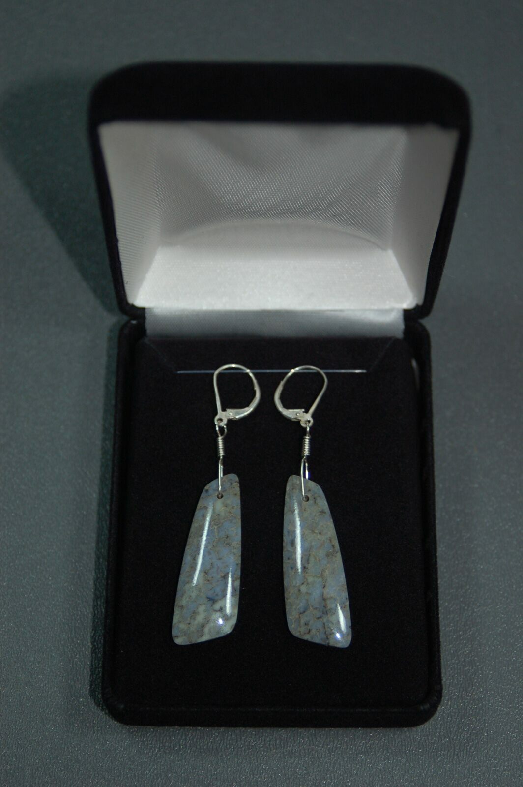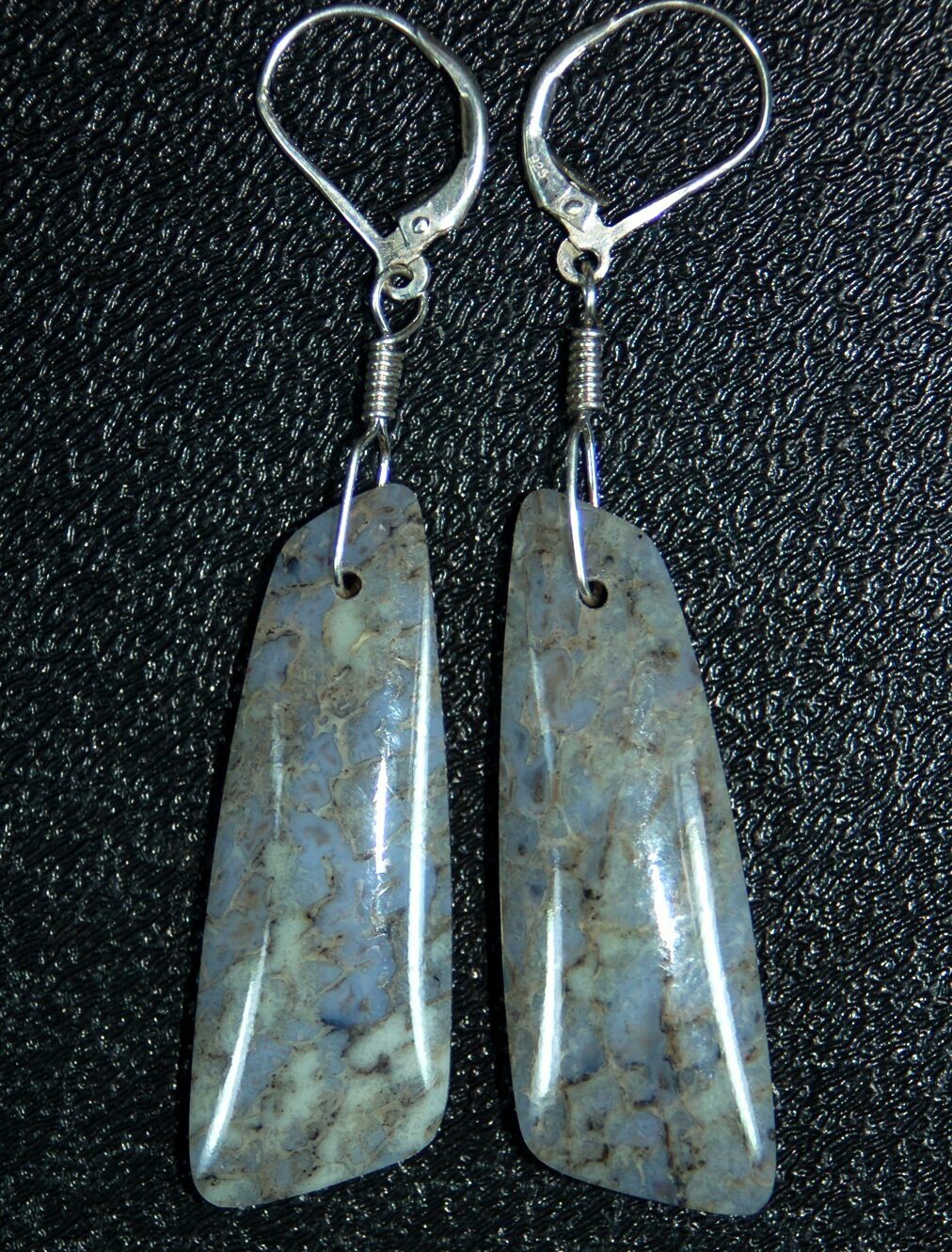 This is a pair of gorgeous trapezoidal earrings hand crafted from 150 million year old, agatized dinosaur bone (gembone) by master stone craftsman, Kenneth Kolb. The amazingly agatized cell structure of the bone creates a blue/green spiderweb appearance. These one-of-a-kind earrings are 1 1/2" x 9/16" x 3/16"
